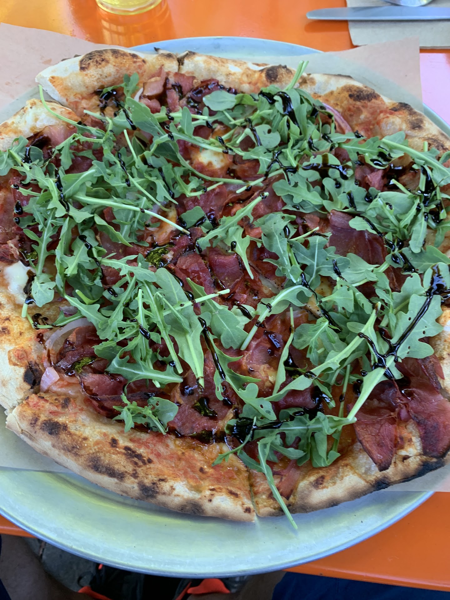 Read moreAwesome outdoor brick oven pizza spot situated inside a beautiful alpine nursery. A few decent beer and wine options complement the relatively basic food menu. Two 12" pizzas and the large kale salad we ordered was a good portion for four adults. The pre-designed gourmet pizza menu is fairly limited in scope, but thoughtfully curated- I liked both pizza options we got, and customizations are apparently allowed if you need something with more traditional ingredient combinations. It's family and dog friendly, with ample seating in a casual, vibrant outdoor atmosphere. I love this concept of a "bistro nursery"- an innovative, modern alfresco dining experience in the beautiful city...