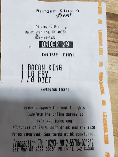 Read moreBurger King will not get my business ever again in Mount Sterling, the atmosphere was terrible, one of the cooks had his stomach hangout out, and I made special requests that my double cheeseburger was on a potato bun because I was allergic to sesame seeds and they did made my foot on a potato but they failed to carefully check because when I started eating I noticed their was sesame seeds on my wrapper and on the bottom of my bun, well I left there feeling sick, when I eat sesame seeds they make me feel sick, my head hurts and I feel like I took a hand full of sleeping pills, it also sets my anxiety off and I was having all them symptoms and on my way home to another town to Powell County I started dosing off on my way to get my kids and I found myself crossing over the yellow line, but thank God no one was around, they the really need to take making...