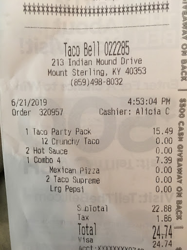 Ā Ā Ā Read moreI love taco bell but the service could use some work. Two people took break at the same time right before I ordered. There was a line around the corner outside the building so I went in thinking it would be quicker. It wasn't, there was 1 person in front of me when I ordered and 2 more people that were there together waiting for food. It took almost 20 minutes for me to get my order. The person working the front kept stopping and catering to 2 younger girls, one of them was calling her mom and instead of working she kept stopping to get them things or talk. They did order but were a bit obnoxious. It shouldn't have taken that long to get my food and no one working there seemed to care or even appear like they were in a good mood. You chose to work here, you can at least pretend you're in a half decent mood. If you really do hate your job please find something else to do. I honestly don't understand how this place usually stays busy with the staff they currently have. Probably going to be a while before I bother coming here again. Would be 1 star if I didn't like the food. At least this didn't screw up the order but if they had after waiting as long as I did this review would have...