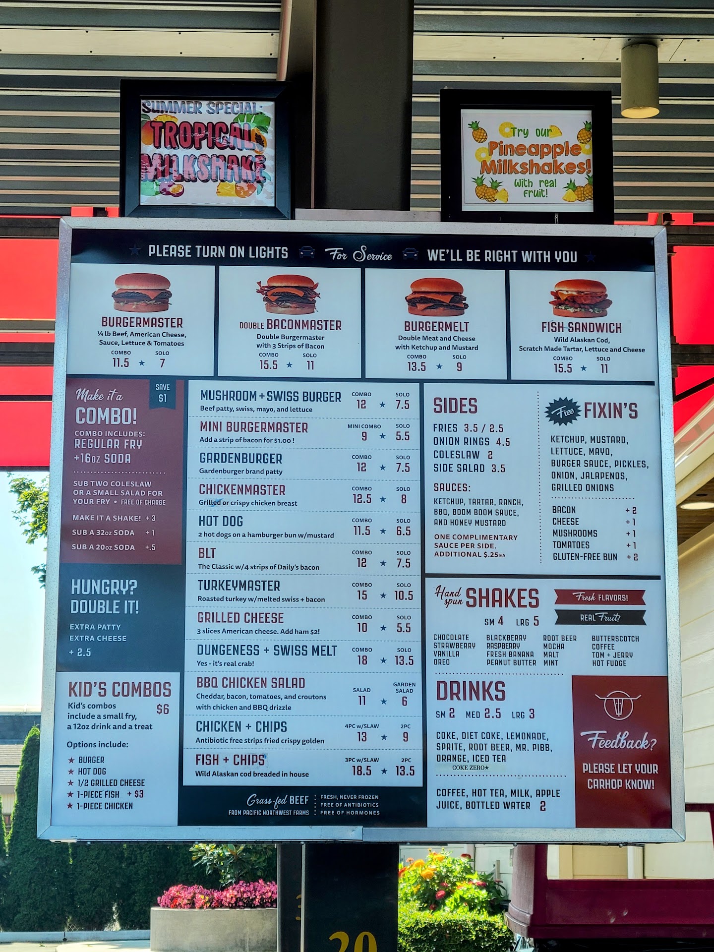 Read moreClassic Drive In fast food experience. The atmosphere is great, though the servers need rollerskates! 1950's music playing in the background, friendly informed staff made ordering fun, and for mid August the flowers around the property were beautiful. And that's just the beginning! The food was great. The Double Baconmaster was delicious, fully loaded sans Jalepenos; though they would have added a great additional layer, my partner requested their exclusion. Will order again. The Dungeness + Swiss Melt (on grilled sourdough) was a favorite, and had us recalling a similar sandwich enjoyed at a Giants game at Oracle Stadium. Mini Burgermasters and a Chicken Finger combo for our littles were, and I quote, "fantastic, stupendous, exciting, and unbelievable." We rounded our meals out with an order of onion rings (with Boom Boom sauce - so good, need a gallon jug for sale asap), and 4 shakes: S'mores (the seasonal flavour), Mint/Hot Fudge/Oreo, Root Beer/Oreo, and Banana/Butterscotch/Oreo. Oreo is a popular flavour amongst my family, obviously. There are a ton of flavours to pick from (some not on the menu like Mango, so be sure to ask), and you can mix up to three for some amazing taste combinations. First time visitors, and we cannot wait to enjoy again. What a great place to eat. Know going in it is a bit pricey, but not outrageously so. $75 to feed a family of 5, including 4 large milk shakes and one side. It can add up quick, but we thought it was worth it. Highly,...
