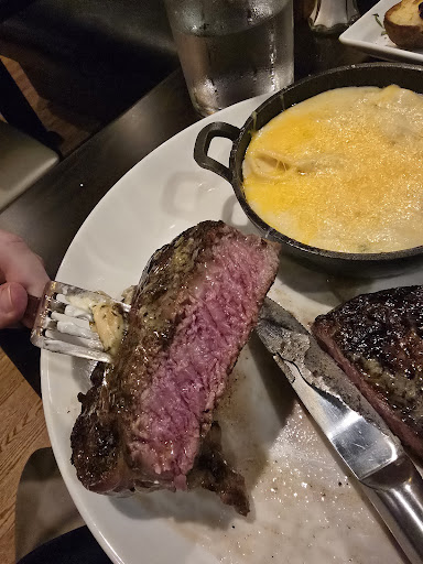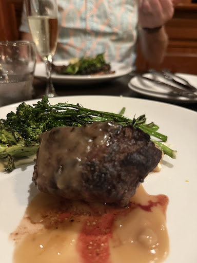 The food - It is a steakhouse, so that is the bulk of the menu. We went for dinner and theres a few other options that looked great but we came for steak. Both of our steaks were cooked perfectly just how we ordered them and rested and seasoned just how you would expect a nice steak at a nice restaurant. But the sides really shined that evening. We had the broccolini, carrots and sweet potatos. Broccolini was excellent in some sort of aioli sauce that was tangy and delicious. The sweet potatos were amazingly simple. Not swimming in sauce or overly seasoned. The chef let the vegetable do the talking and it did not disappoint. Keep it simple in this case was genius. The glazed carrots were our favorite and a must have side. Cooked to perfection and charred on the grill, sweet glaze balanced with fresh greens on top, providing a hint of spiciness.