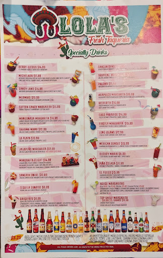 Read moreI love Mexican food and was glad to be trying somewhere new to me! Lola's has a large selection of drinks from the bar available that all look wonderful. I couldn't bring myself to pay 17 bux for a beverage. Also it should be noted that all beverages are in a bottle or can they have no cups with fountain drinks so bring a water or you buy a bottle water. I ordered a burrito and the came out saying they ran out of chicken. So I got steak. It was really huge and delicious! The green verde sauce on the side is not over powering or too strong but a good addition to the burrito. Fresh Chips and salsa came to the table as we were seating I love that! The servers speak Spanish so if you are bilingual that will come in handy. It isn't a problem by any means they are sweet, pleasant and were able to get the orders in. We also had empanadas, and Lola's special. We were happy with everything we ate. The tables are SMALL so if you are large you may not be too comfy with more than 2 at your table. I went with my 2 sisters and it was a nice place for conversation. No really loud music, happy vibrant decor. I would love to come back once the weather is good and enjoy the...