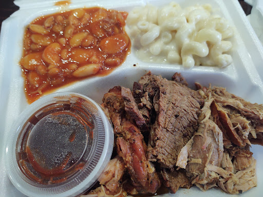 Read moreCombo Platter: Brisket, pork, chicken. Mac N Cheese, Baked Beans. Side is sweet BBQ.