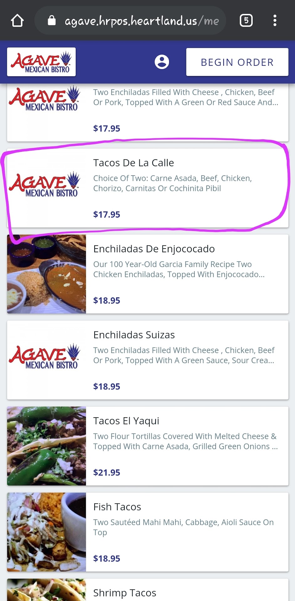 Read moreI usually am really generous with my reviews but I couldn't help but give a 1 star review to this restaurant because of so many reasons. I ordered Tacos De La Calle from Agave for pickup. I looked at their Google menu and noticed that the cost for Tacos was $11 so I told my roommate to get me that (that was my mistake. I should have looked at the online menu on their website) and later found out that the cost of those 2 tacos was $18 + taxes. Because of the whole covid situation, I understand the reasoning behind the price hike (if that is the case) and I am totally fine with it but what bothers me is the fact that the food was sub-par (it may even be the most expensive and worst tacos I have ever had). Both tacos just had dry meat and lettuce in it and nothing else (no salsa, guac, dressing) and the size of the tacos was really disappointing as well. It came with a side of really salty chips and really salty and bitter green sauce (chilli Verde I believe). There was also rice and beans but rice was uncooked for most part.