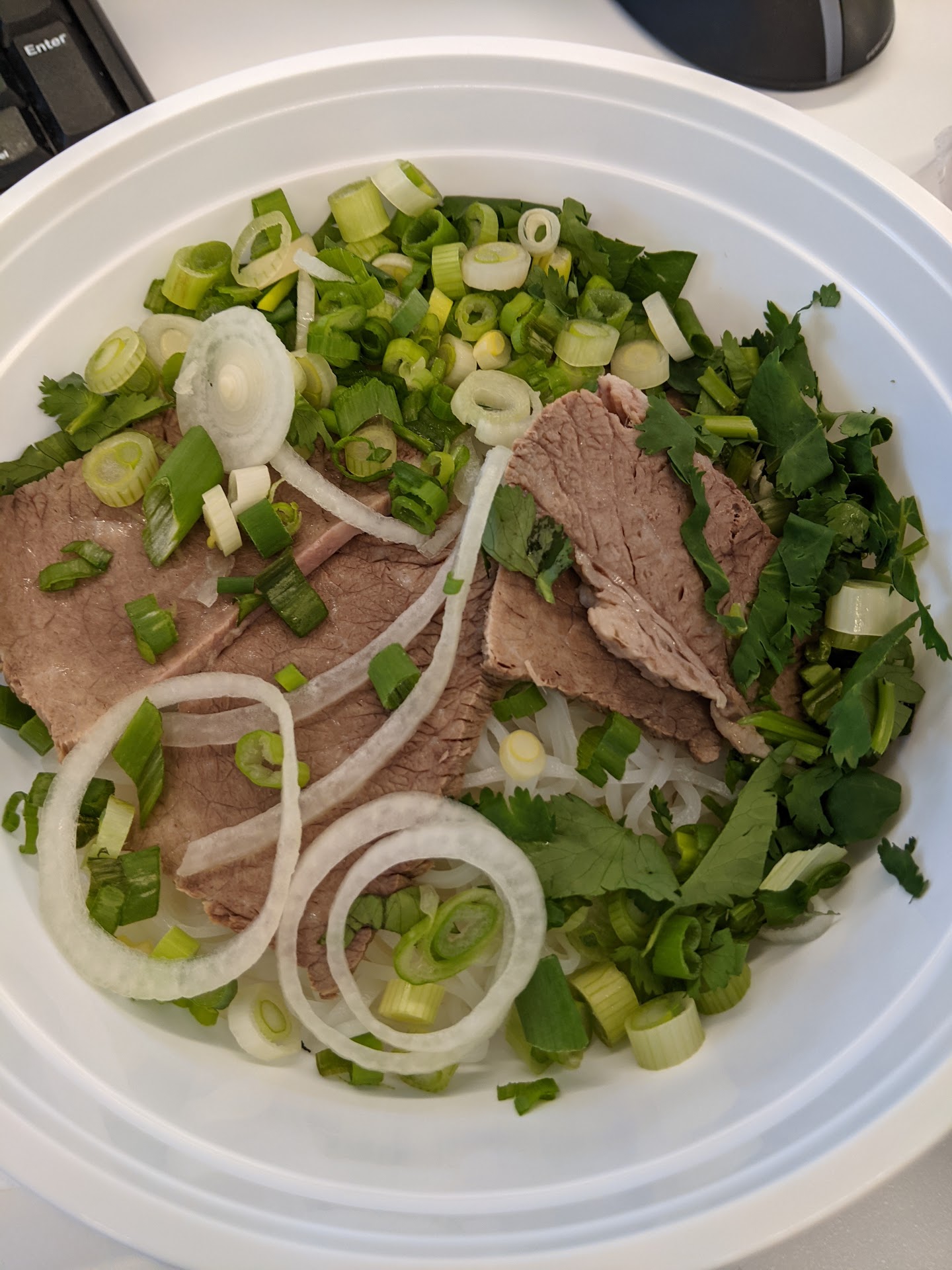 Veggie Pho: broth was actually ok. I prefer regular beef broth, but for a veggie broth it was ok. Plenty of noodles, but too many big chunks of horse carrot! I found myself just eating bite after bite of hunks of carrot that it dominated and took over the flavor of the entire dish and really ruined the bowl of noodles. 2 out of 5 very generously given.