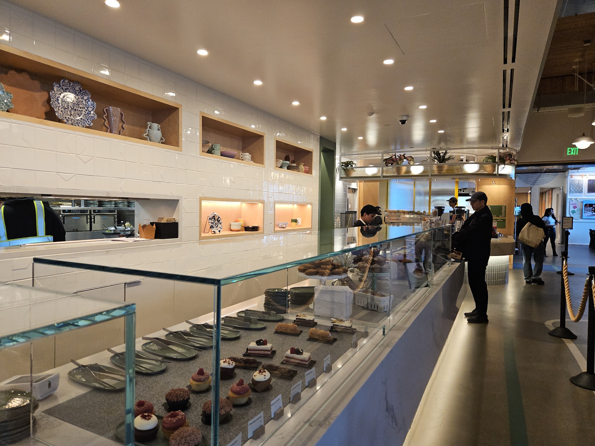 It has a very artsy vibe to it. There is a wall of shelving facing the food line that showcases some interesting coffee cups that are not for sale. As we were waiting for our pastry, we noticed an artist putting the finishing touches on a geometric mural at the entry of a meeting room.