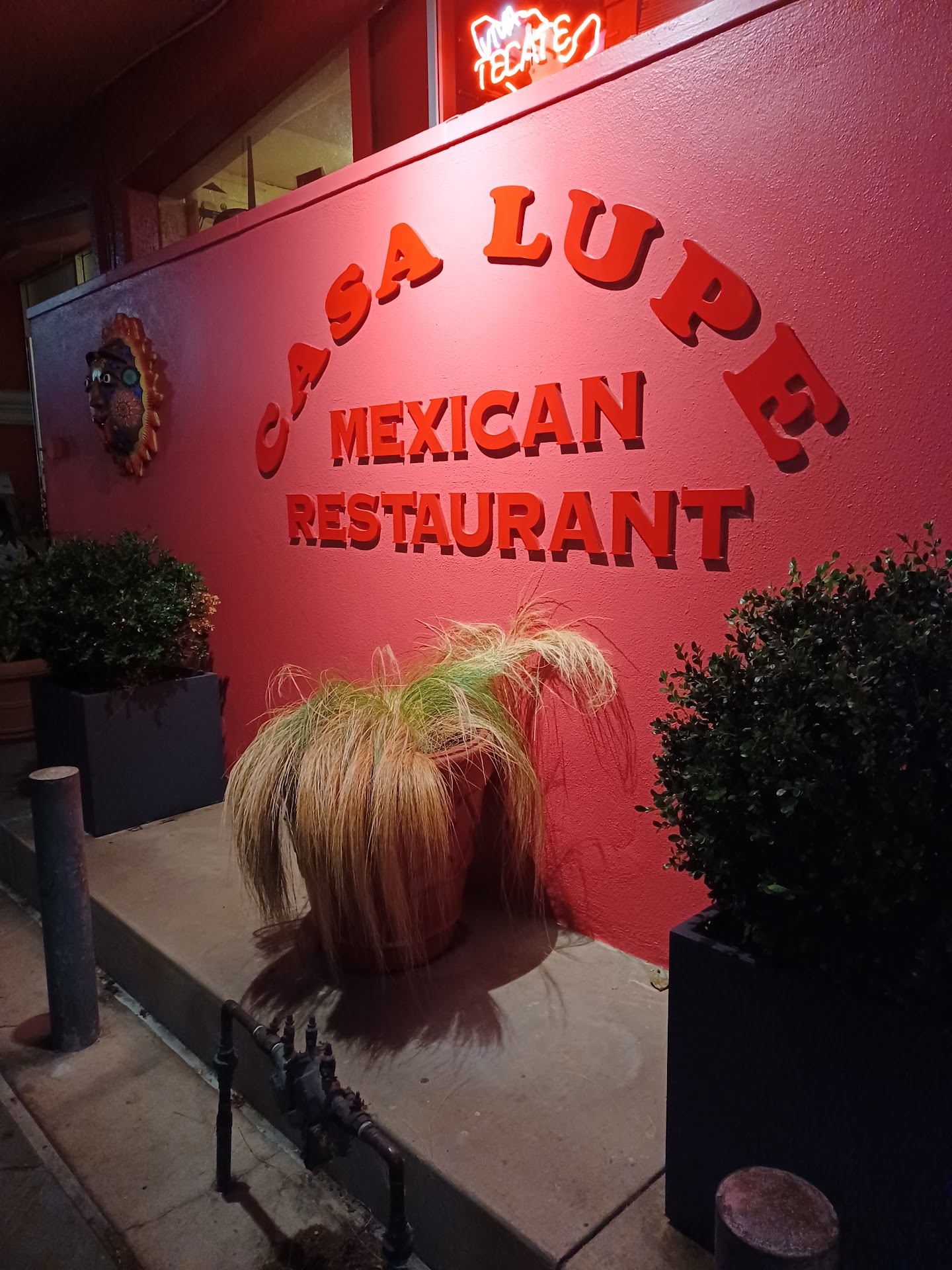 Casa Lupe - Though I live in San Jose, and, more in the south eastern part, I hopped on a bus to downtown, and, took the lightrail to Mt View. Probably an hours trip altogether, but well worth the motive of attending one of my two favorite Mexican restaurants - the 'Casa Lupe.' It's one of a chain, sprinkled elsewhere in the Peninsula. My introduction to this beautiful laid-out restaurant, was in Los Altos, going as far back as the '70s.' My only other favorite (Mexican restaurant), that takes a close second, is called, 'Station 55,' located just around the corner of 5th, and, Monterey Rd., in the old town of Gilroy. Getting off the lightrail in Mt View., I had to walk many blocks to get there (Casa Lupe), but, time passed quite quickly, as the entire street of Castro, is dedicated to pretty much nothing but restaurants, and, bars, and, a whole lot of lights galore, you'd almost think it was Christmas. The street abounded with tables, and chairs, and, people all seeming to be, in a partying mood. But, there were shops and botiques, as well - a couple that came to mind - is one with photographs peering out through the window, of old San Francisco, San Mateo, and, Palo Alto, and, OMG, if it isn't Keeano Reeves, dressed up as probably a 18th century officer in the English Royal Guard. Another store, featured actual sewing machines of different periods, such as 1881. Wow! And then, stepping up, to a 1920, 1925, and, 1957. The various models, put you in mind, of the annual car changes that go on in the car industry. Well, at last, I arrive! Ah! How wonderful to be back. The outer wall was decorated in traditional Mexican attire. You at first, come into the pateo - very nicely laid out, and, no different in style inside. And yet . . . even though it was a little brisk outside, I chose to sit in the pateo's corner, that looked to the outside lights, and ferns, firelamps, lanterns, and, motifs in the center, surrounded by greenery salamanders. And, maybe you could spot a third, if you take my punnery hint. Inside, the tables are covered in brown leather, with stylish, colorful placemats, and, cushioned wooden chairs at their sides. I asked at first, for a cup of coffee, making no mention as to it being hot. This is the place where you can get a guaranteed hot cup of coffee. The time was 7:45, I noted - well within the 9 o'clock closing time, and soon also, I was well warmed up to accept my entrèe - the 'Ranchero' - 2 enchaladas (choice of beef or chicken). I chose the beef. And, of course, accompanied by the usual rice and refried beans, with, no less then a whisp of sour cream - to top it off, and, on a plate so hot you have to wonder why its not glowing a vibrant red color. And, it was absolutely, exquisitely, delicious . . as always. The whole meal, and coffee, being a pleasant $25. I was tempted on the flan, for desert, but it seemed just a bit pricey, at $9. This would be the place to order it. But then, I'm really not a big dessert eater. I was quite content, just to hold the line where I was at. Boy!! . . what a great meal! So, for a real tasty Mexican treat, and delight, at a very classy restaurant, you just have to come and visit, Casa Lupe, located at 459 Castro, (just 2½ blocks down from El Camino, on the right side), in Mt. View. Almost a stone's throw from the Civic Center, and, The Center for the Performing...