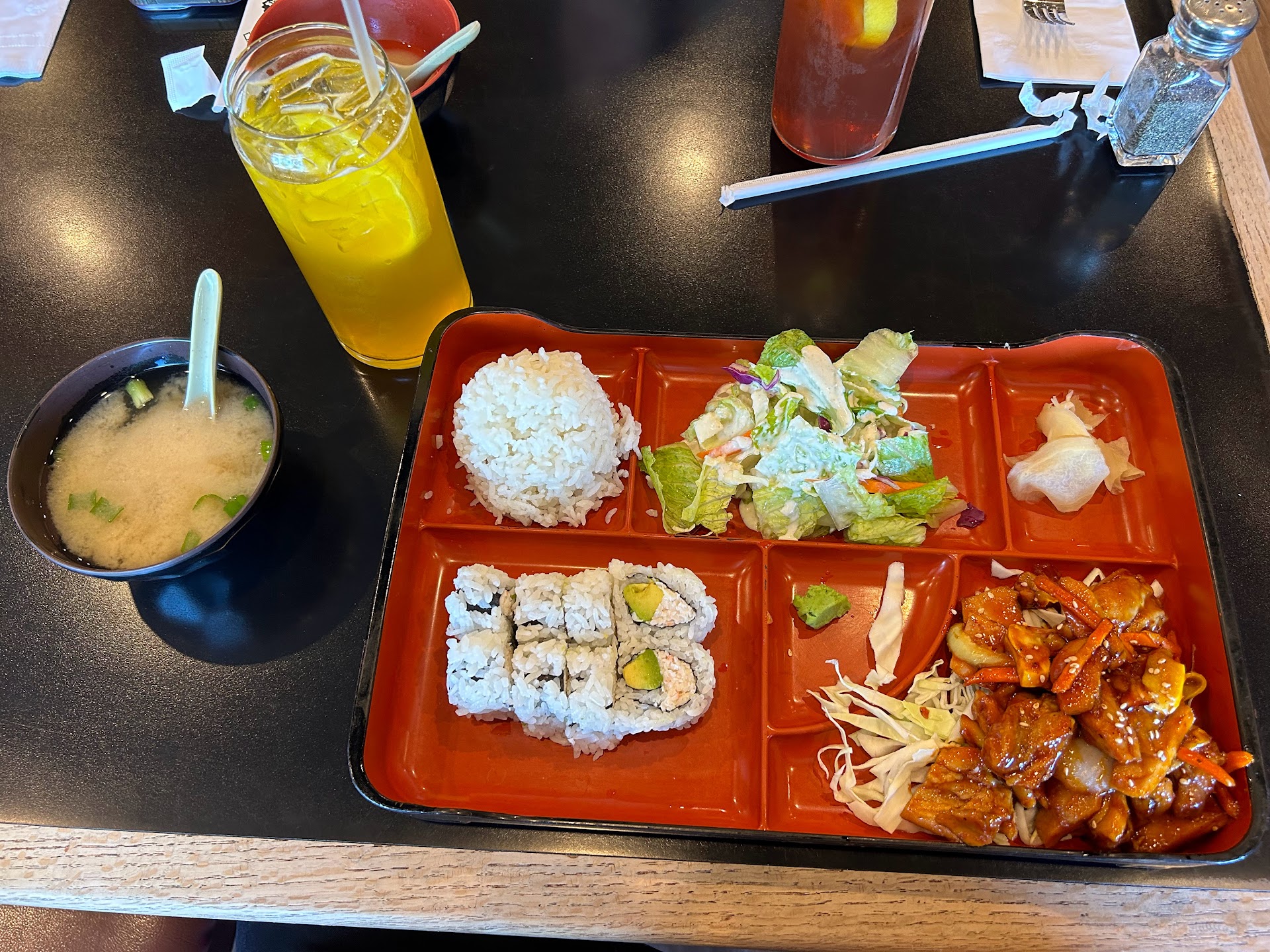For my protein, I chose spicy chicken. It was juicy and well-seasoned, though I wished for a spicier kick. The California Rolls (8 pieces) were fresh and delicious. I also ordered a passion fruit green tea, which was refreshing and garnished with two slices of lemon.