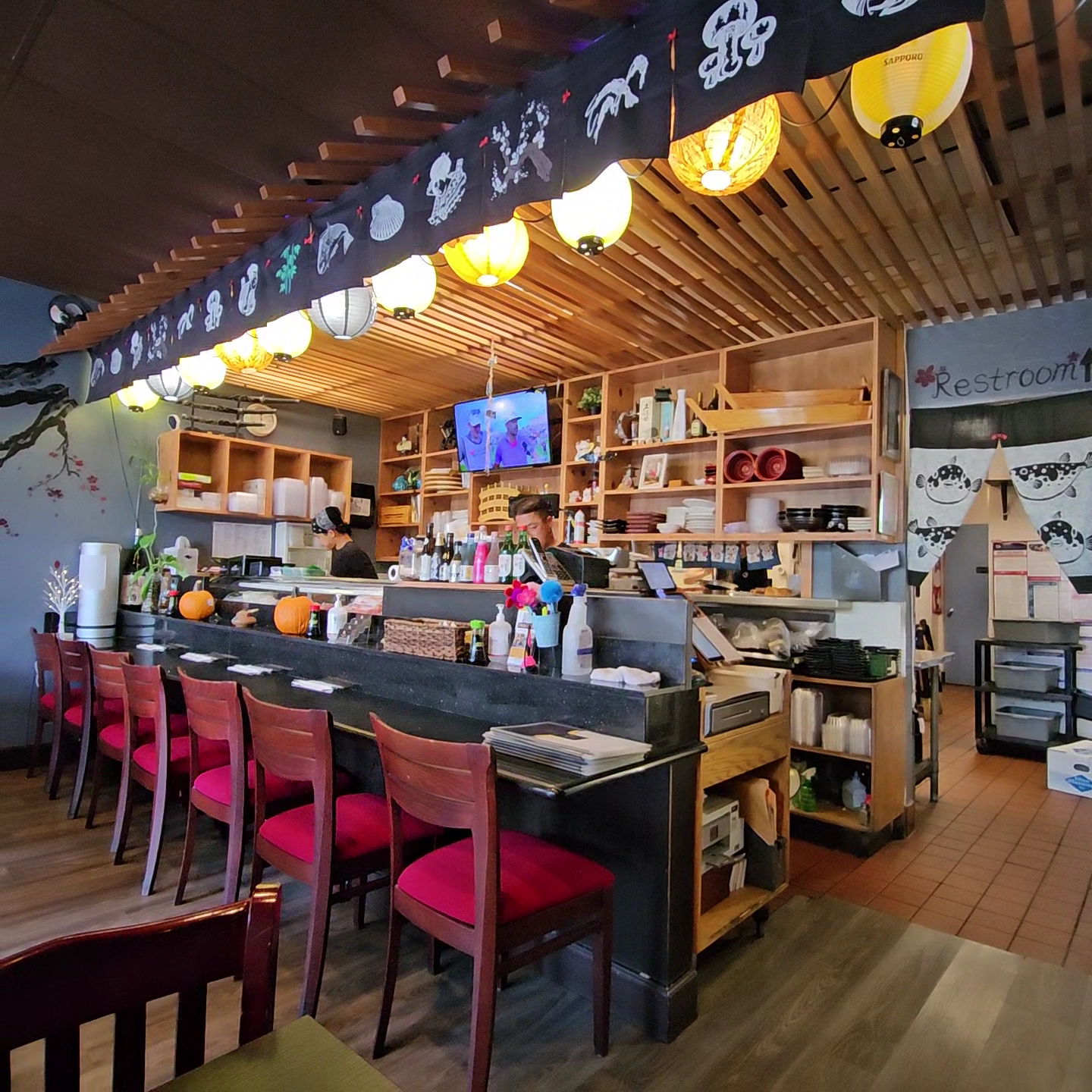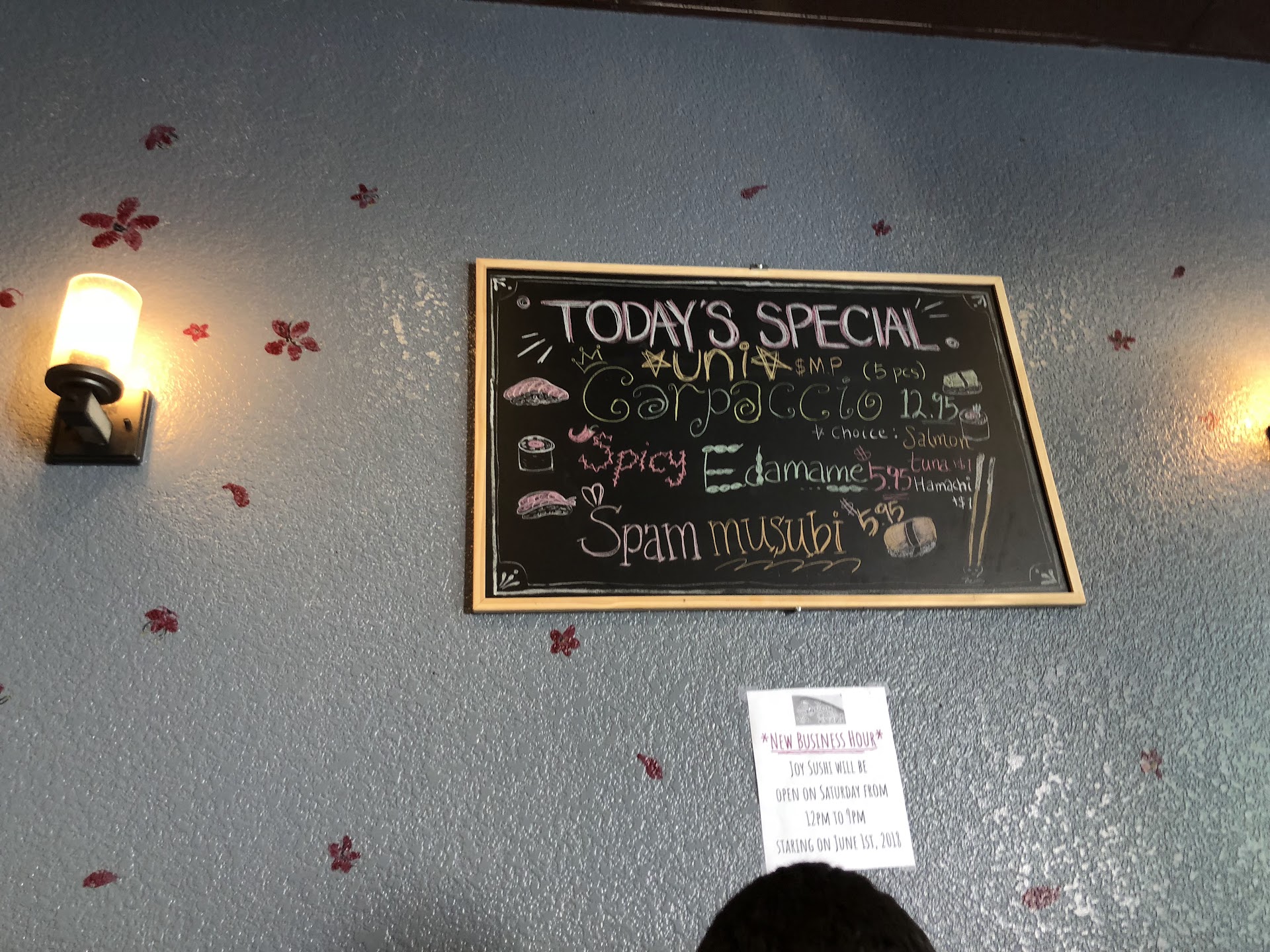 Just a week earlier I thought Ariake Sushi Boat was small. In comparison, Joy Sushi is tiny. Like Ariake, Joy is stacked in a strip mall, but a much smaller one where traffic is also much smaller. Unlike Ariake, Joy uses some very fine and unique Japanese style decors, mixed with modern lighting and a wall of Polaroid selfies. In contrast, its sushi bar is nondescript. Seating is also rather tight.