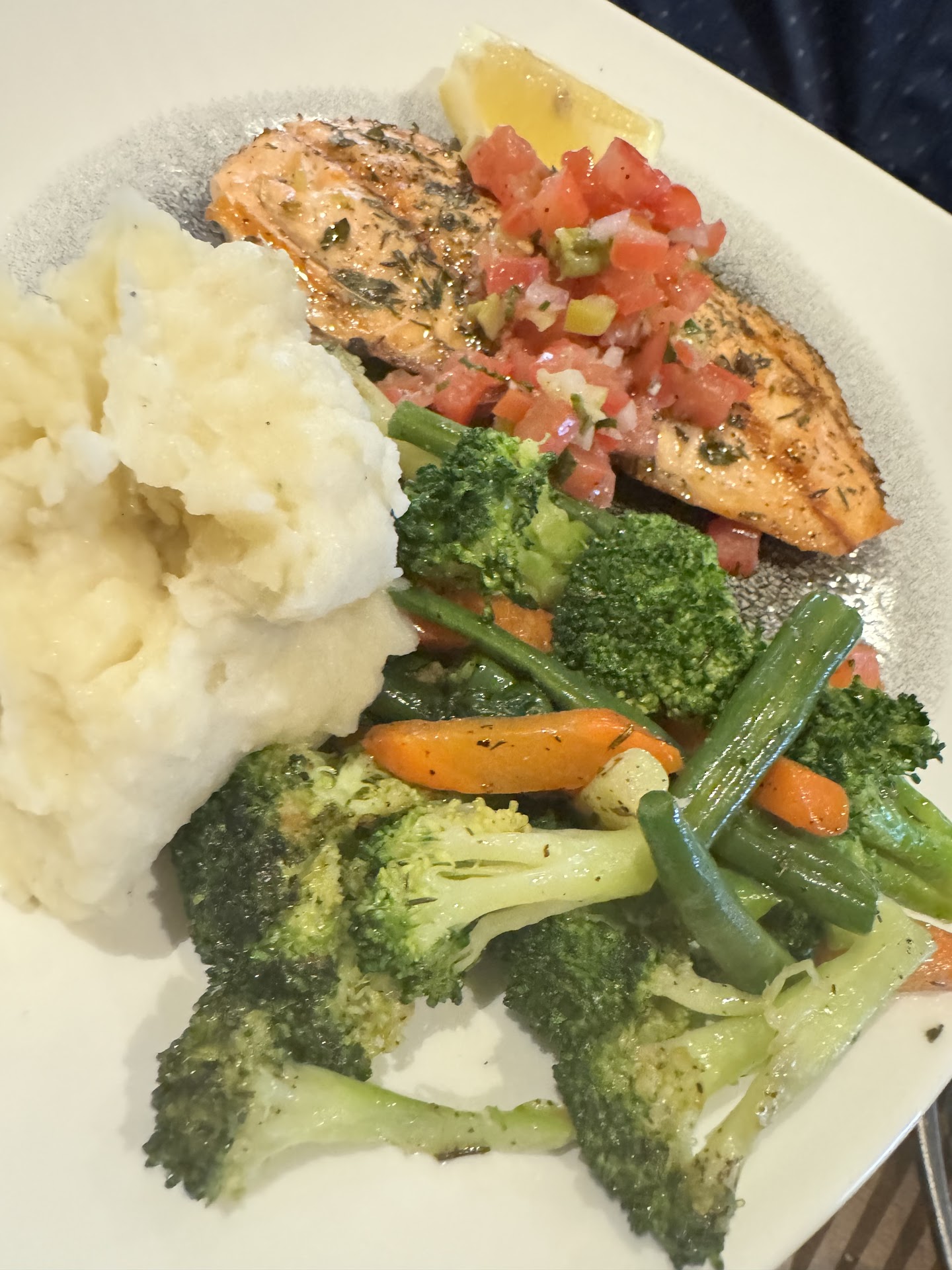 Mushroom cream soup had lovely full mushroom flavor & mouth feel: not heavily creamed. Beet arugula salad was crisp & fresh (after requesting balsamic + oil to moisten). Smoked salmon resoto incorporated sundried tomatoes & broccoli, and offered a subtle, well rounded taste experience. Duck breast in cranberry sauce w wild rice was another winner; the skin was charred and peppered. The cranberry sauce was great, but a bit more savory and pepper would have gone a long way to rounding out the flavor. Duck itself was exactly done: the main part (except the end bit which was too well done) tender and juicy. I did not eat the skin as it had a layer of fat (it's an American duck folks) attached - fed it to our dog, who really appreciated it 🙂 Dessert of lava cake & chocolate gelato delivered full-on chocolate without being too sweet. Perfect.