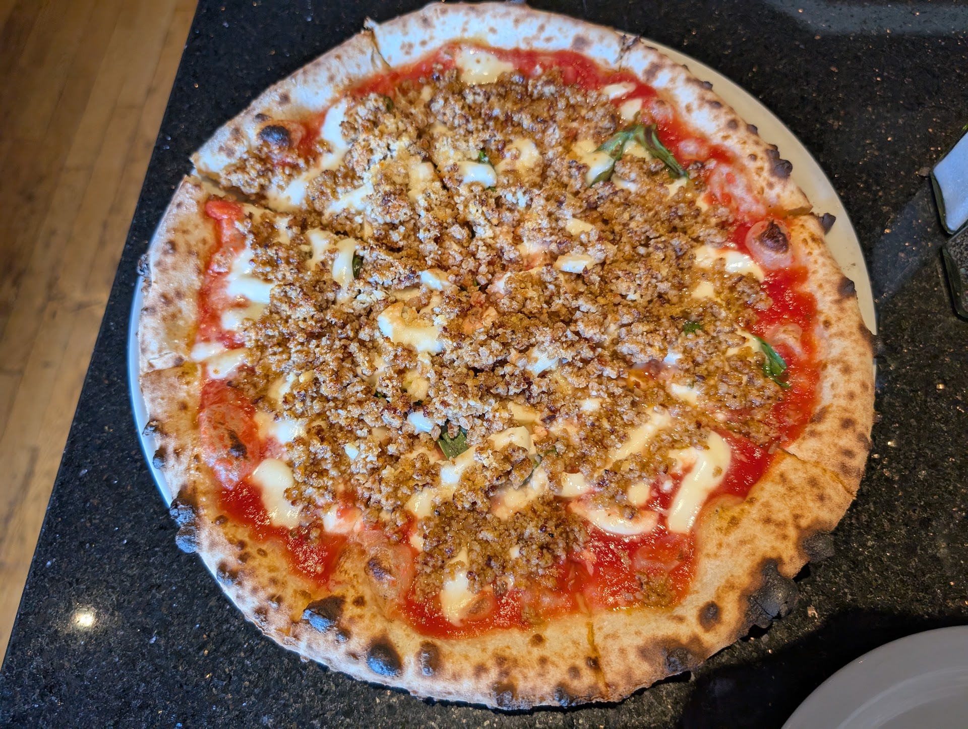 Went with a friend of mine that is from Naples, Italy. For him, Neapolitan style pizza is an art form and this place serves up the Michelangelo of pizzas! We arrived for lunch on a Saturday afternoon, early. As such, we were able to score the best seats in the house! Seated at the bar, right in front of the authentic brick pizza oven. This thing was shipped over brick by brick from Naples. They maintain a wood fire in there with a steady temp of 600 degrees. Super fun to watch them hand toss the dough and the pizza cook in literal minutes. Many of the toppings are added AFTER the pizza comes out. Fresh arugula, prosciutto and a drizzle of olive oil. YUM!!!