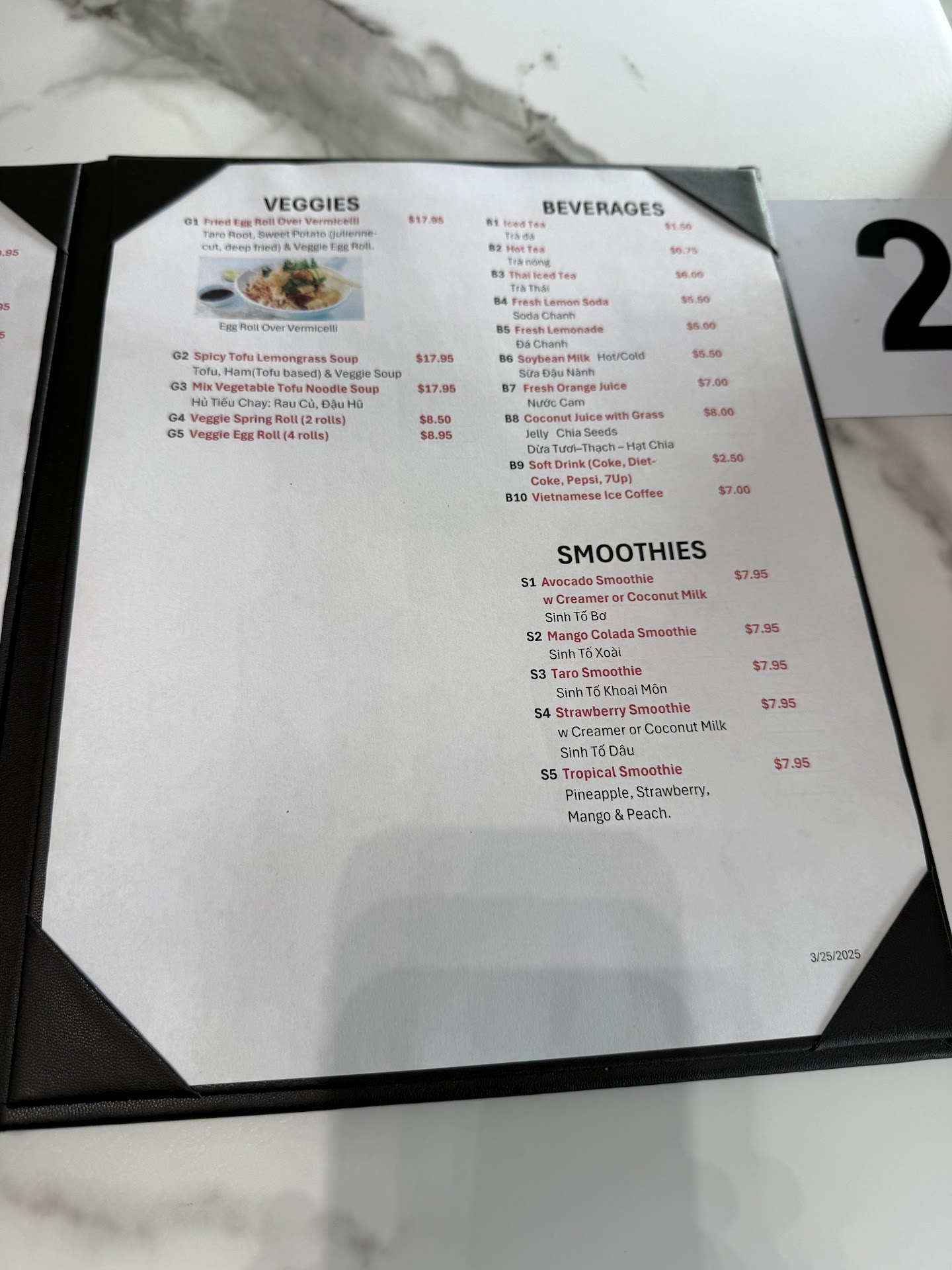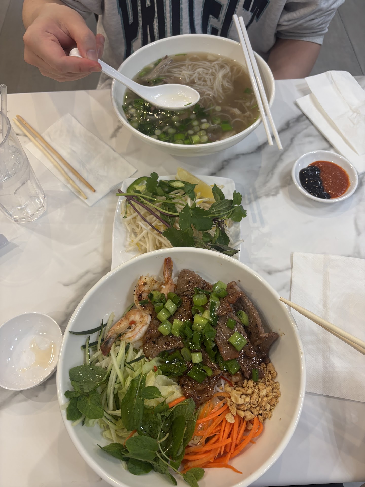 Menu has quite a few classic items, from pho to rice plates to vermicelli. I ended up ordering the Grilled Shrimp Beef Eggroll Over Vermicelli (V2). For the value, the portion is standard, ingredients are fresh, and the beef is packed with flavor. My partner enjoyed the Rare Steak/Flank/Brisket/Tendon/Tripe (P5) with its flavorful broth and impressive portion size.