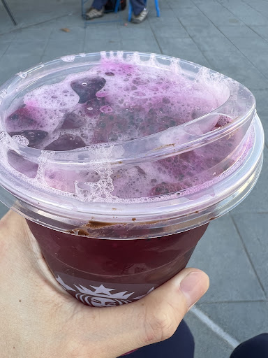 My friend choose - Strawberry Açaía Lemonade Sweet strawberry flavors, passion fruit and açaí notes balanced with the delightful zing of lemonade, served over ice with freeze-dried strawberry pieces. The ultimate pick-me-up your afternoon is calling for.