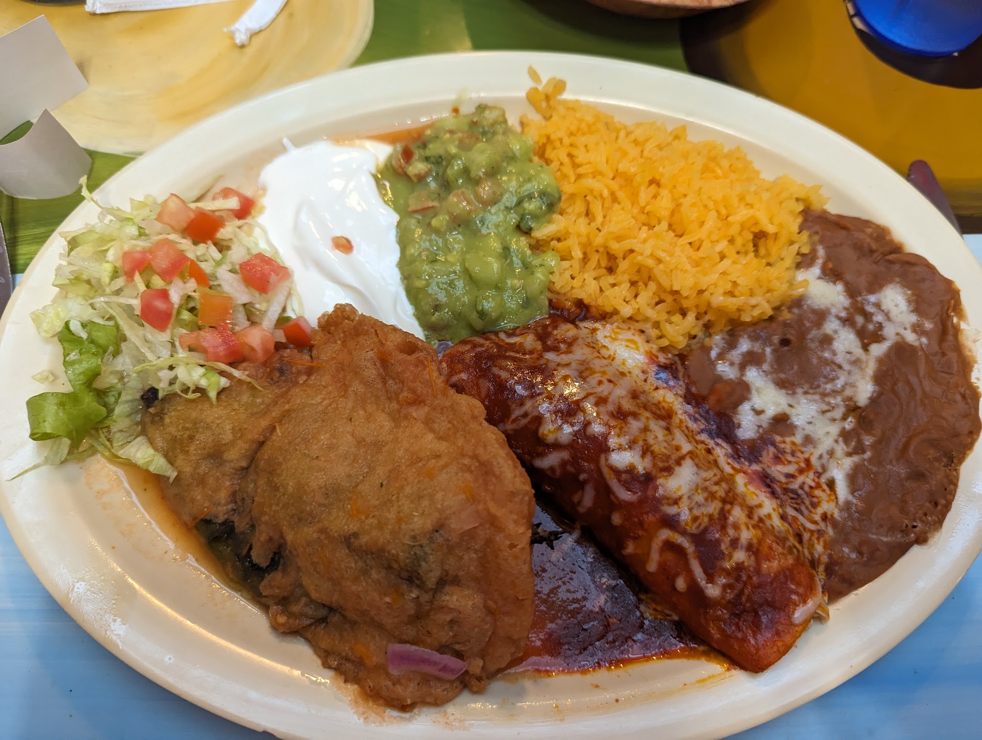 Food: crunchy taco - seemed like it was deep fried in-house at some point, decent crunch and taste; first filled with cheese, then meat, and lettuce; then covered in more lettuce, some sour cream, and a slice tomato; pretty difficult to eat since it was overflowing super? taco - served atop 2 soft tortillas, it was piled high - I ate half the piling on top, then used knife and fork to eat the rest, I couldn't actually eat it like a taco meat: pollo asado carne asada