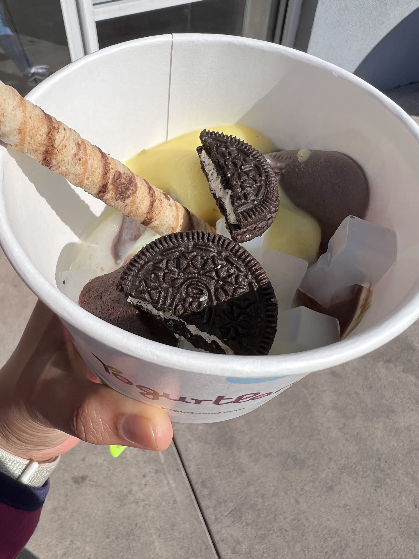 I think the froyo here doesn't look as nice in the cup because the dispenser doesn't have the star tips. So my froyo looks like tubes or blobs of color instead of pretty piped frosting. Store inside appeared to be clean, and you can eat outside at the tables.