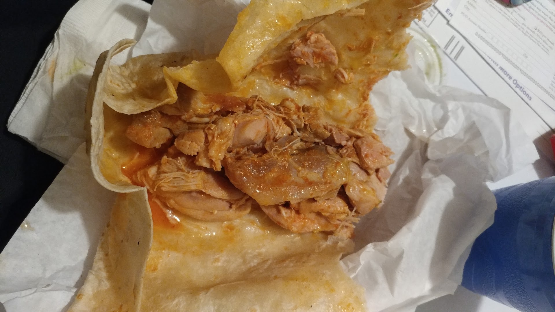 A few weeks ago, I stopped in to get a burrito before the restaurant closed for the night. I ordered a "chicken burrito," paid $10, and took my food home. A couple bites in, I noticed that I was only tasting chicken - no beans, no rice, no nothing. I opened up the tortilla and found that, indeed, the ONLY thing inside was chicken! I was so hungry that I ate half of it, took a photo for reference, and threw the rest away. When I ordered a "chicken burrito," I expected to get everything that comes on a normal burrito - beans, rice, cheese, lettuce, salsa, etc.