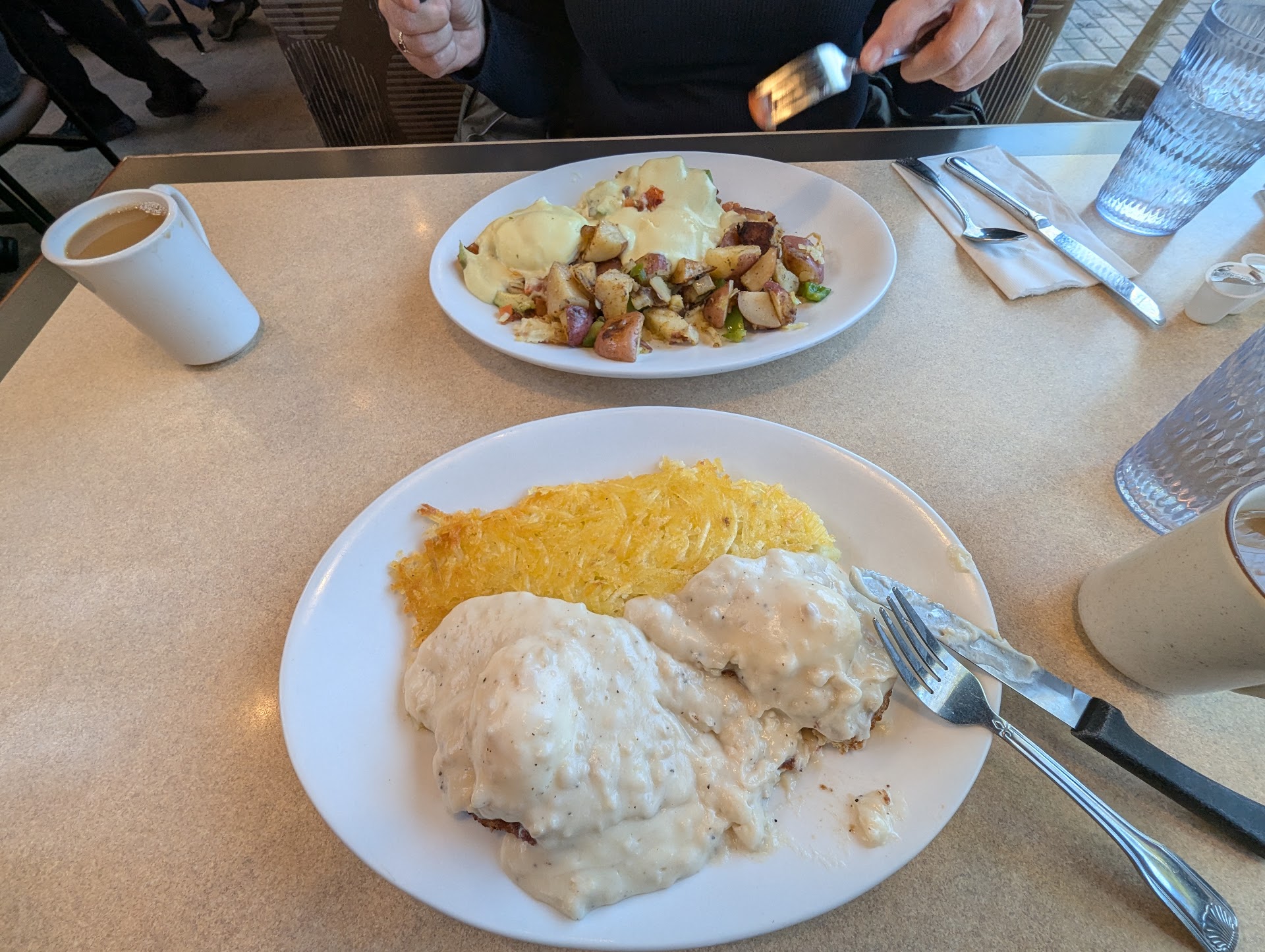Ordered the Chicken Fried Steak with O'Brian potatoes while my girlfriend had the Santa Fe Scramble with Hash-browns to go.