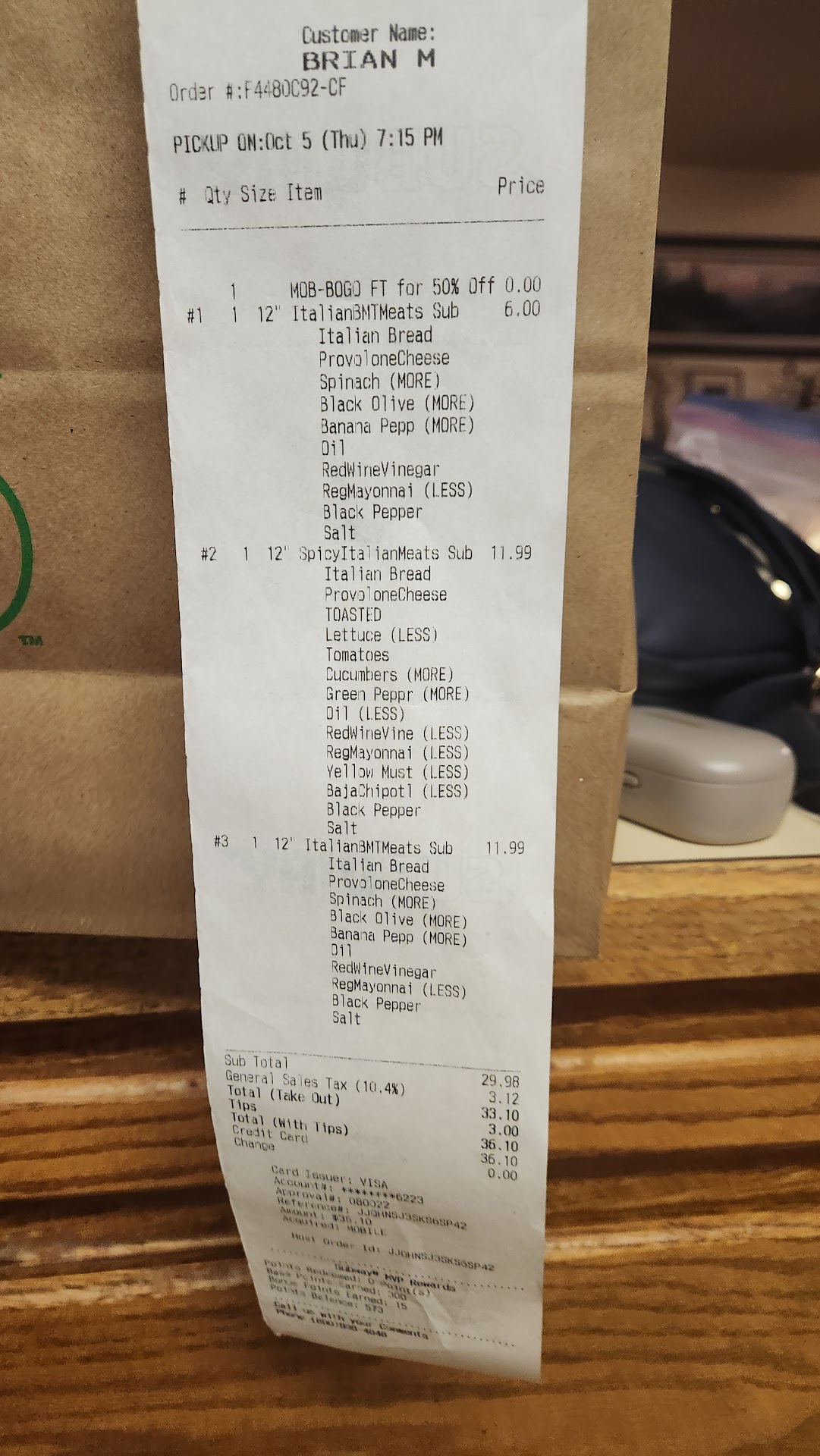 If you're using any type of coupon, I recommend going to another store. The owner of this Subway treats every ingredient like it's precious and tries to cut costs wherever possible. When we handed him our coupon at the counter, he immediately restricted us to ordering only the classic subs listed on the whiteboard, denying us any other options. We knew this wasn't right because we had used the exact same coupon at other stores before and carefully read the restrictions. We argued for several minutes until he finally allowed us to order what we wanted. Later, he apologized with a nonsensical excuse that didn't even make sense. We ordered six 1-foot-long subs, but as a former Subway worker myself, I noticed he skimped on the amount of meat and veggies. Our subs ended up being almost half as thick as usual and tasted awful. The owner of this store lacks proper service, common sense, and morals. I definitely won't be visiting this...