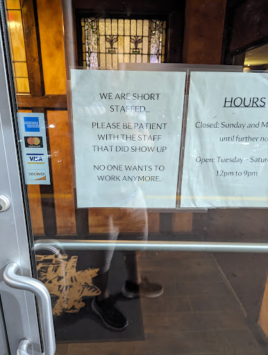 I'll start by mentioning the only good thing about our experience the service. Our server was extremely nice and attentive. Now comes the bad and there was a lot. To begin with before even entering the restaurants a sign is posted stating that no one wants to work anymore (see attached picture) as someone who had made a career out of the hospitality industry this strikes me as extremely disrespectful. In my personal experience the reason a small business loses their staff is always due to management. Those at the top need to take responsibility for their own staffing issues and acknowledge that if they can't keep staff it is systemic problems within the establishment. Second the food was extremely poorly prepared. I like to believe this was due to understaffing in the kitchen and probably more likely the management forcing the kitchen to use sub par ingredients due to cost. All our dishes were bland as could be and extremely watery. Finally, and I cannot emphasize this enough this restaurant clearly has a strong history in the area and has the potential to come back if management, mainly the owner, chooses to listen to their staff rather then blaming others. I really don't want to see a small business fail, but it was clear from the moment I walked in that the issues they are currently struggling with come from the top and unless something changes we will see this...