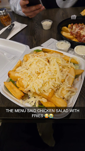 I also ordered what was listed on the menu as a chicken salad with fries. Imagine my astonishment when I opened the carton to see all of the fries ON TOP of the salad. The salad was also terrible. And the fries were soggy.