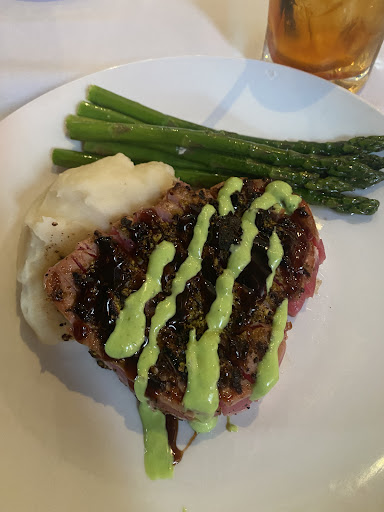 Ahi tuna Never been to a restaurant that was bold enough to not season their asparagus and their mashed, which btw is the weirdest pairing for tuna and wasabi, like, tha F. This is cooking laziness to its full potential. Cannot taste the pistachios at all, the wasabi is way too overpowering, it honestly tastes store bought instead of using a nice wasabi powder. The tuna sear is excellent and thatâs the only one thing I can say was good about this plate. Honestly the parts that are not completely drenching the tuna with wasabi are tasty, good umami flavor and can actually taste the pistachios which I think is a great pairing, scratch that, the part I ate after removing 20 oz of wasabi from it was perfect, great concept and idea, bad execution.