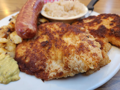 Schnitzel is pan fried, not deep fried Bratwurst is decent in taste and its overall consistency