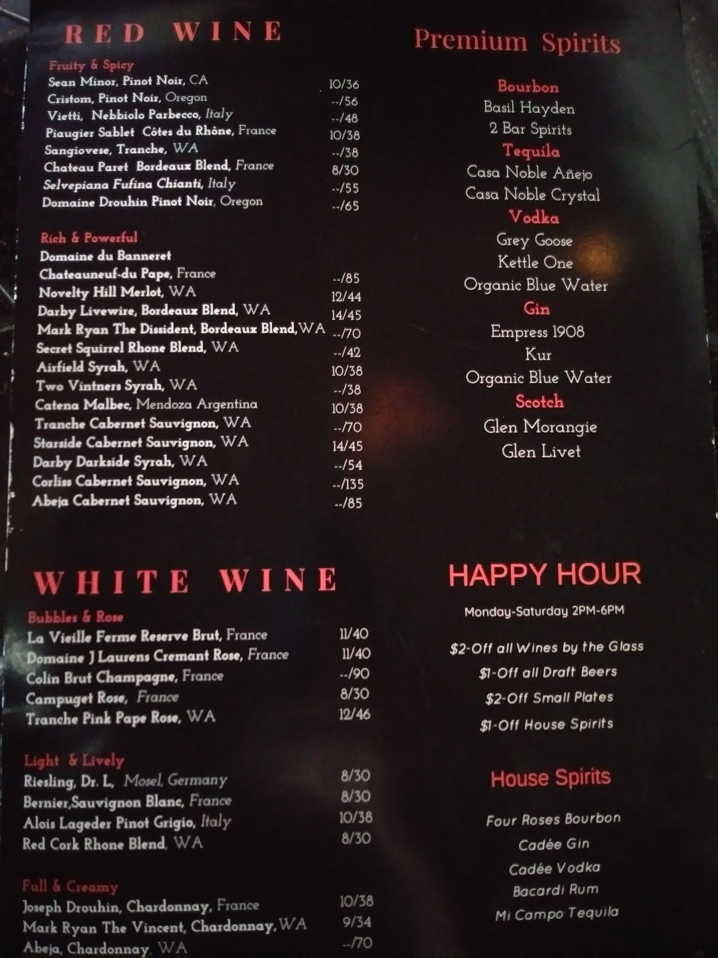Food: pics of menu attached- "Small Plates" menu: tried Kalbi Marinated (steak) skewers (2) with spicy korean coleslaw, steak was perfectly cooked. The "slaw" (I hate coleslaw generally, zero spicy guy trying to expand my palet) I got halfway through til I probably hit a seed and I was done for, people who like spice this would probably be medium to you. I paired this plate with a Sean Minor Pinot Noir, CA...perfect smooth pairing to the steak.