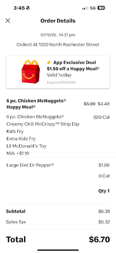 I pulled all the way around the building and then stopped at window 3, a rarely used waiting window at this location. I was nearly immediately greeted by a scowling young lady (the one who originally made the mistake of handing my order to the wrong car). She nearly threw the crumpled bag into my car as I apologized for some reason and then said thank you she abruptly turned and stomped back into the store. I was concerned that this order came out so fast there was no way it wasnât the exact same bag, and it was crumpled and looked very handled BUT I did not see the pink mark Iâd made on the bag so I checked the order and left. The fries were cold but everything seemed to be there and I was done waiting and complaining for now.