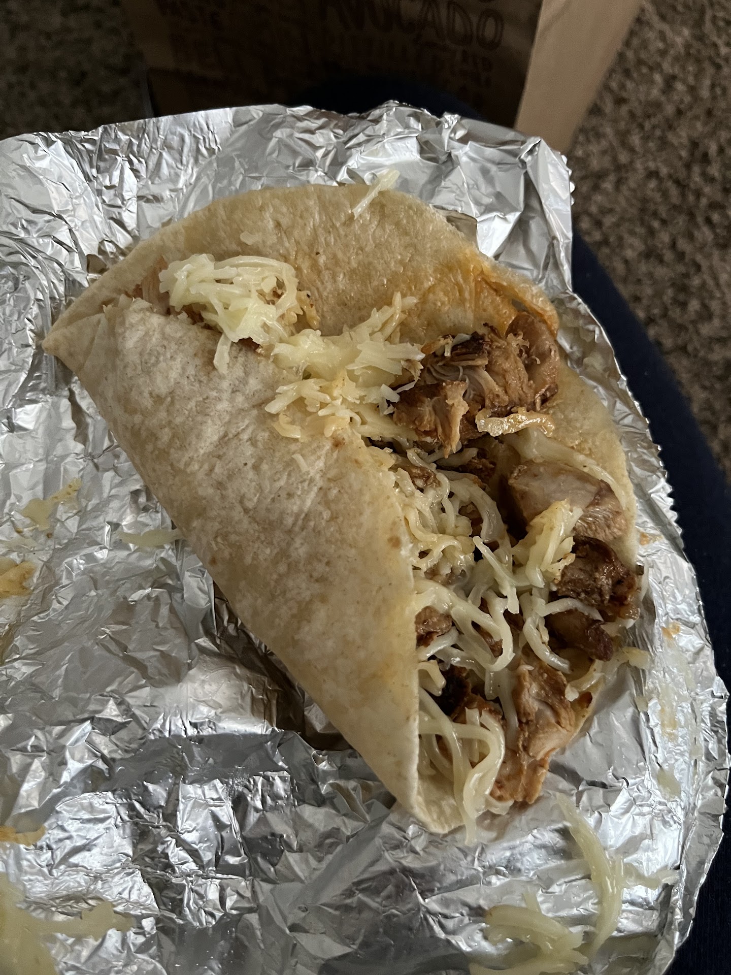 I ordered a kids meal for my son. Just a simple chicken and cheese quesadilla, since the one I got last night was fine I figured this one would be too and paid for my order and left. When I got home and tried to open the quesadilla, basically the entire filling of the quesadilla was stuck to the foil. I literally had to rip it off. She didnât fold it in half, let alone make sure that it was folded correctly to make an actual quesadilla. It looked like a terribly put together taco. My son isnât that old, so I have to cut up his quesadilla and by that point it wasnât even a quesadilla. It was falling apart and just basically a deconstructed taco and didnât look anything like how it looked last night.