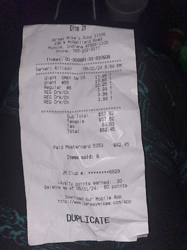 Read moreI was looking for something on the menu and the girl asked what I would like. I told her what I really wanted was hot chicken and portabella mushrooms with provolone cheese. She says that is a 65 which isn't up on the menu. I get it back to work and it has red and green peppers and onions. I am allergic to peppers. I called and while they did apologize there was nothing they were willing to do to make it right. Taylor said I should have informed them of my food allergy. My reply was when I asked for chicken mushrooms and cheese that is what I expected. Again, they would not make it right. I said thank you very much but I will no longer be a Jersey Mike's customer. In addition, Jersey Mike's responded to my review and they say I didn't give them the opportunity to make it right. Two phone calls to the store to two different people and all they said was I'm sorry. I have women that I work with who heard both phone calls. Again, I won't be supporting this store...