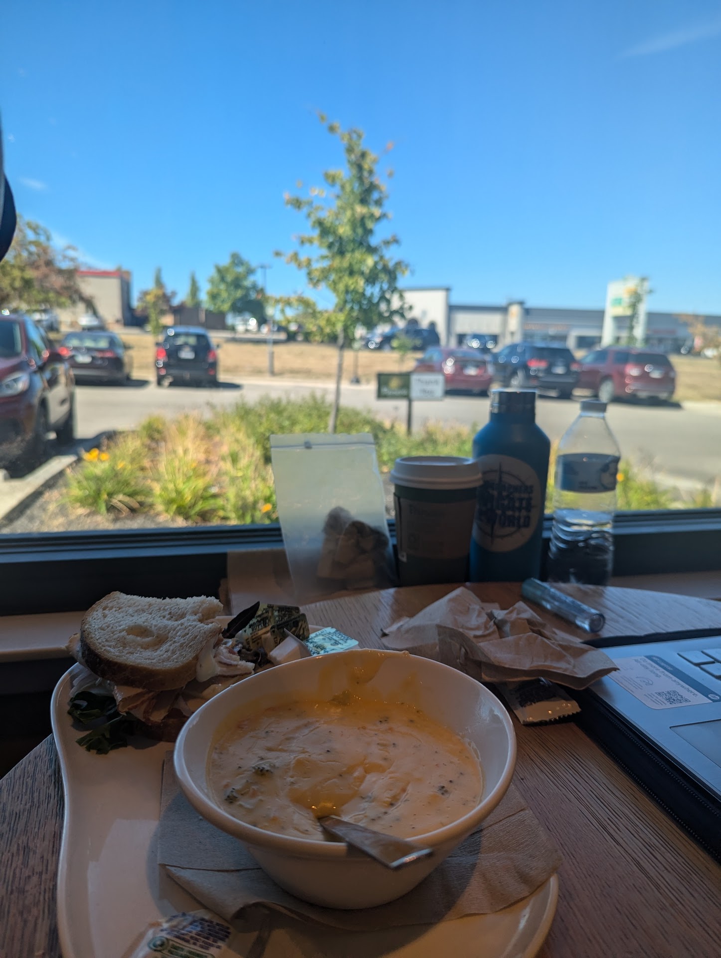 Read moreJust had the worst grilled chicken avo BLT I’ve ever had. The sandwich was almost not edible due to it falling completely apart. Instead of avocado spread or slices they put half an avocado on it. The chicken had little flavor and was flat and it was cut up and it place all through out the sandwich and it just fell out of the sandwich. I got two slices of bacon they tasted fine, a bit too much lettuce but it was fresh, and two small slices of tomato but was okay as well, bread was good enough taste but was not toasted as it’s supposed to be. But when I tell you bring trying to keep it together to eat was a hard job, ended up just taking pieces of chicken and cheese off the paper after taking bites. During this visit they didn’t label any of our sandwiches, which is ever irritating too. Over all, not good flavor, not good quality, and dysfunctional to eat. I will never get sandwiches from Panera again, especially for the prices. I did give the atmosphere a 4 because it was actually...