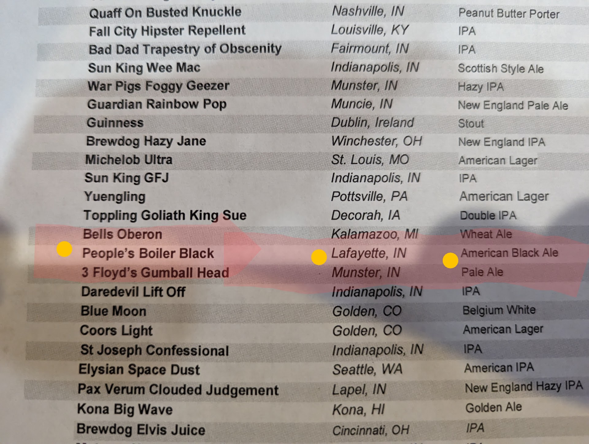 The menus clearly describe what's in or on everything. They have an extensive craft/micro brew selection, with many from local/regional Brewers, as well as many popular commercial brews. I highly recommend the People's Boiler Black - rich coffee and chocolate flavor but not as thick as a stout.