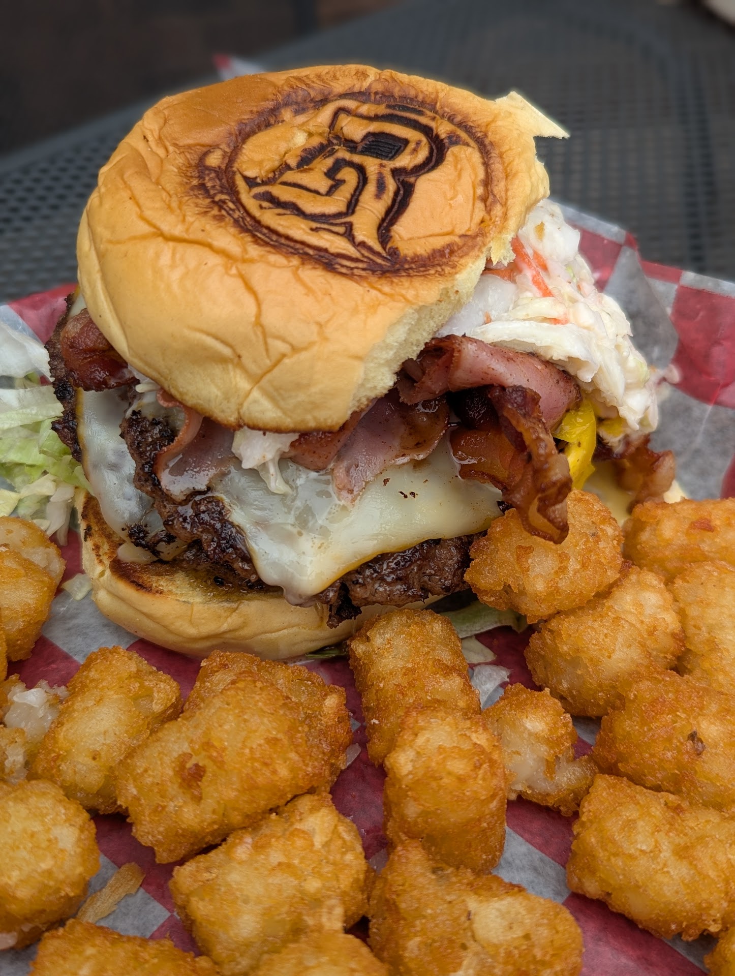 My wife and I split 2 burgers: the PB&J and the Trippin Timmy mushroom. First, all the burgers are "smash" style, so thinner with crispy edges, medium well done (not my personal choice for burgers, but it's how they make them.). The PB&J has a great ratio of peanut butter to jelly, and has smoky bacon and the surprise addition of spices jalapeno - it works so well together yet makes no sense! The Trippin Timmy had a generous amount of mushrooms and grilled onions and was more a traditional burger choice. Both were very tasty. We got an order of tots as well as their cucumber tomato salad. All of the sides were very tasty, though the cucumber and tomato salad is thick cut, as a note.