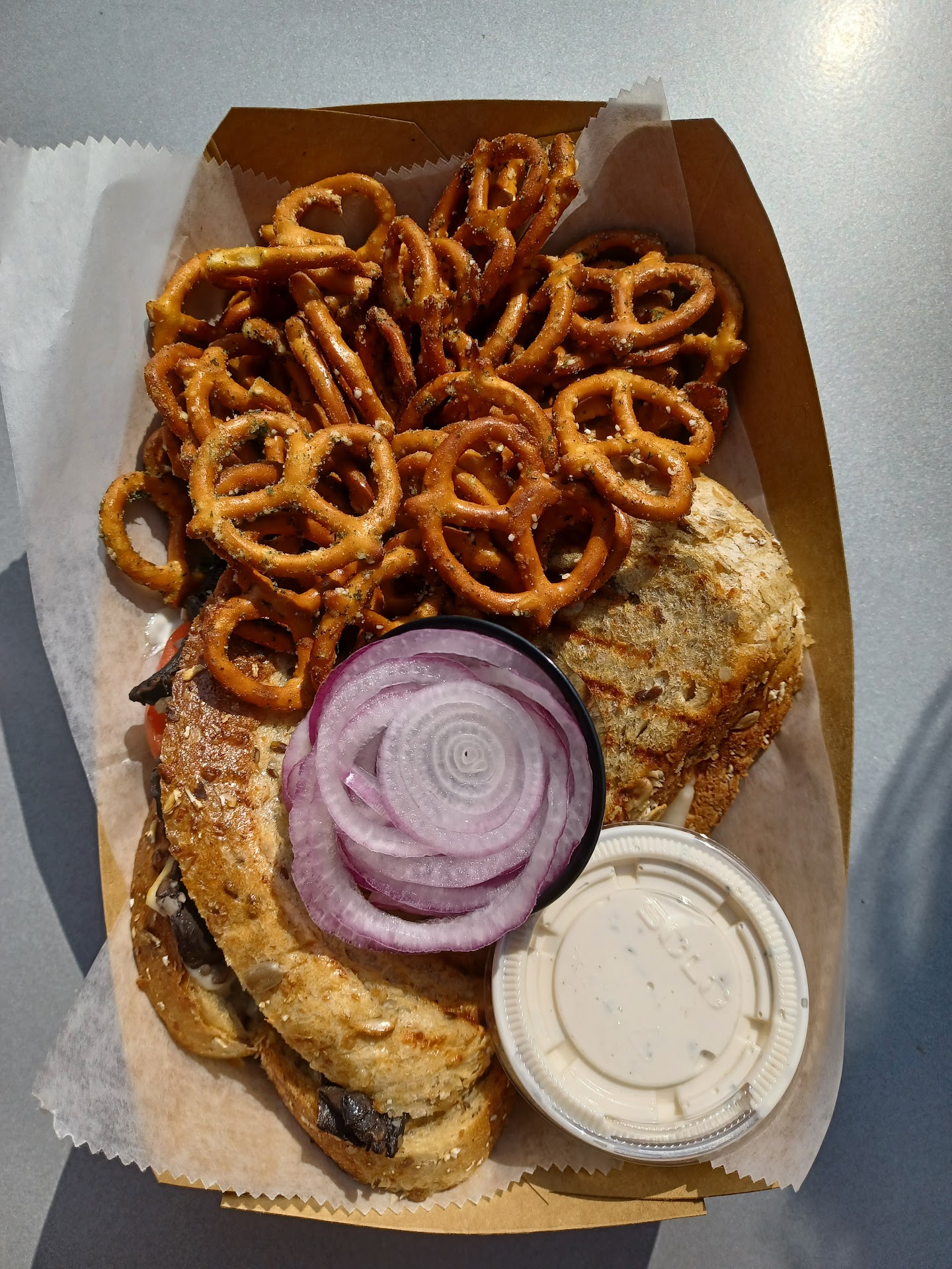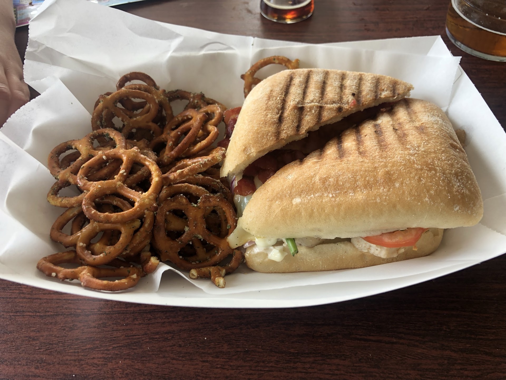 My wife had the chicken bacon panini topped with garlic aioli, spinach, aroma tomato, red onion, muenster, and mozzarella cheese on a ciabatta bun ($11). This was an outstanding sandwich and it was served with some housemade flavored pretzels and dip.