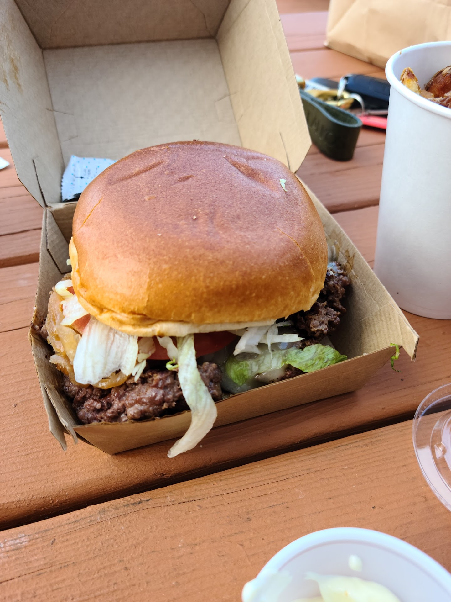 Read moreAtmosphere feels very much like a trivia bar night, without the trivia, so that's disappointing but not bad. I could definitely see a fun trivia or karaoke night! Gives the vibe of a bar and Culver's chain combined, in a good way. Lottts of different seating options, and it looks like it has a fun deck in the back! It's also got a huge bathroom! I fully expected a tiny 2-stall or even a single, but 3 stalls in the women's room, all with a large doorway and ample space for wheelchairs, though only the middle stall had stability bars. Now on to the food!: LOVED the variety of sandwiches, and the ordering process was made much easier by the employee on register; they were incredibly patient AND good at explaining the options - perfect for first-time eaters. The drinks are self serve, the coffee was good (a local blend!), and I was impressed with the size of the portions for the pricing on one of the Lil Eh! combos. The pattymelt was HUGE, my friend said it tasted great, and we'd be up for trying the other specialty creations in the future. Plus, there was a santa dinosaur, dressed to impress, right when you first walk in. But speaking of walking... there are a couple tables on the ground level, so easy for a wheelchair to access, but no way for a wheelchair or walker to enter the building - there are 6 or so 4" steps up into the building proper, and it didn't seem like there were any other entryways besides the back deck, which is raised and with many steps as well. Ultimately, a great burger joint, and I'd love to see it in the...
