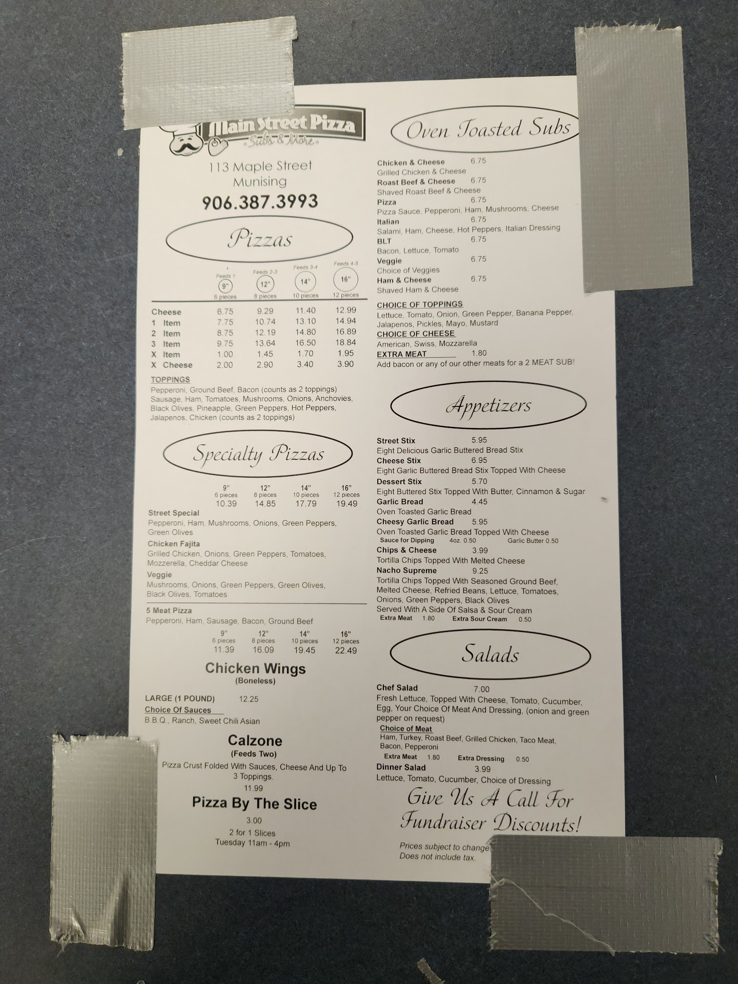 Read moreI'm originally from Munising so whenever I'm in town visiting family a stop at Main St is a must. It's, unfortunately, gone downhill the past couple of years. I love the pizza still but the service is awful. They can't handle how busy they are. I stopped in right when they opened on a Sunday. The counter kid had zero idea what he was doing and another guy in there looked ready to lose his mind. I understand they are busy and maybe understaffed but yelling at one another in front of customers and it taking an hour to get my pizza order when I was the second person to order that day is ridiculous. I saw many natives of the town go in and out with pizza quickly. Perhaps if they knew me by sight as not a tourist, I wouldn't have watched my last pizza go in the oven 45 minutes after I ordered. As I finally had the pizza and was packing up my car, angry guy was outside smoking complaining loudly to someone that "no one has anything else to f*ing do but order pizza on a sunday!?" I'll keep coming back because, let's face it, main st is a Munising institution. But I really hope they get their crap together with...