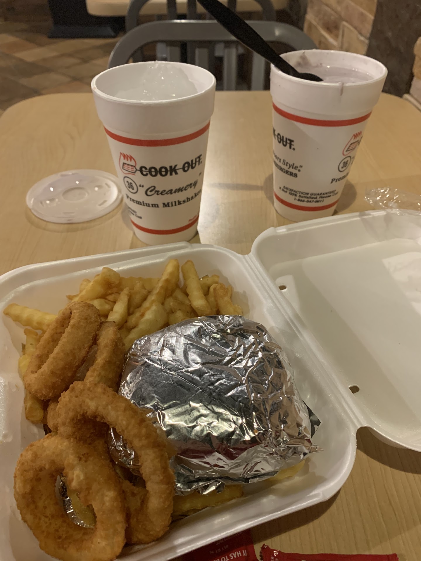 Cook Out is fast with 2 lanes. I'm sure they have slower service during a rush. Who doesn't? They aren't perfect (stay away from that taco meat and cheese in a chip bag - not for me) Lol, just trying to be fair. Most of their sides are good - and a little different. I like the Cajun chicken wrap and bacon wrap. Onion rings and burgers are good. Maybe there are larger portions out there as well as some smaller.