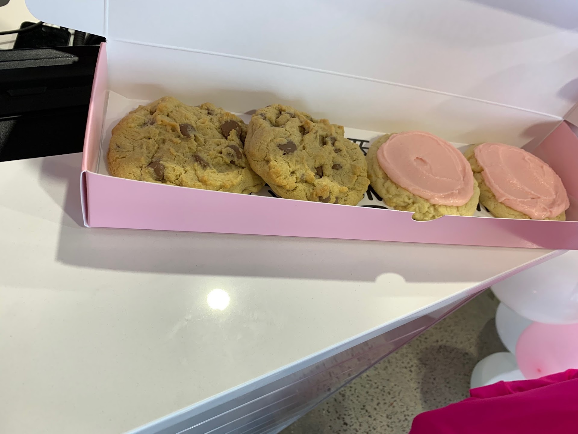 I went to Crumbl the weekend they opened. As you will see in my picture, their opening balloon wreath was in place! On that day, the cashier did a great job of explaining background on how they make their cookies, that the frosted sugar and chocolate chip are always available, and that the other flavors rotate. There were just two other customers, and things went relatively fast.