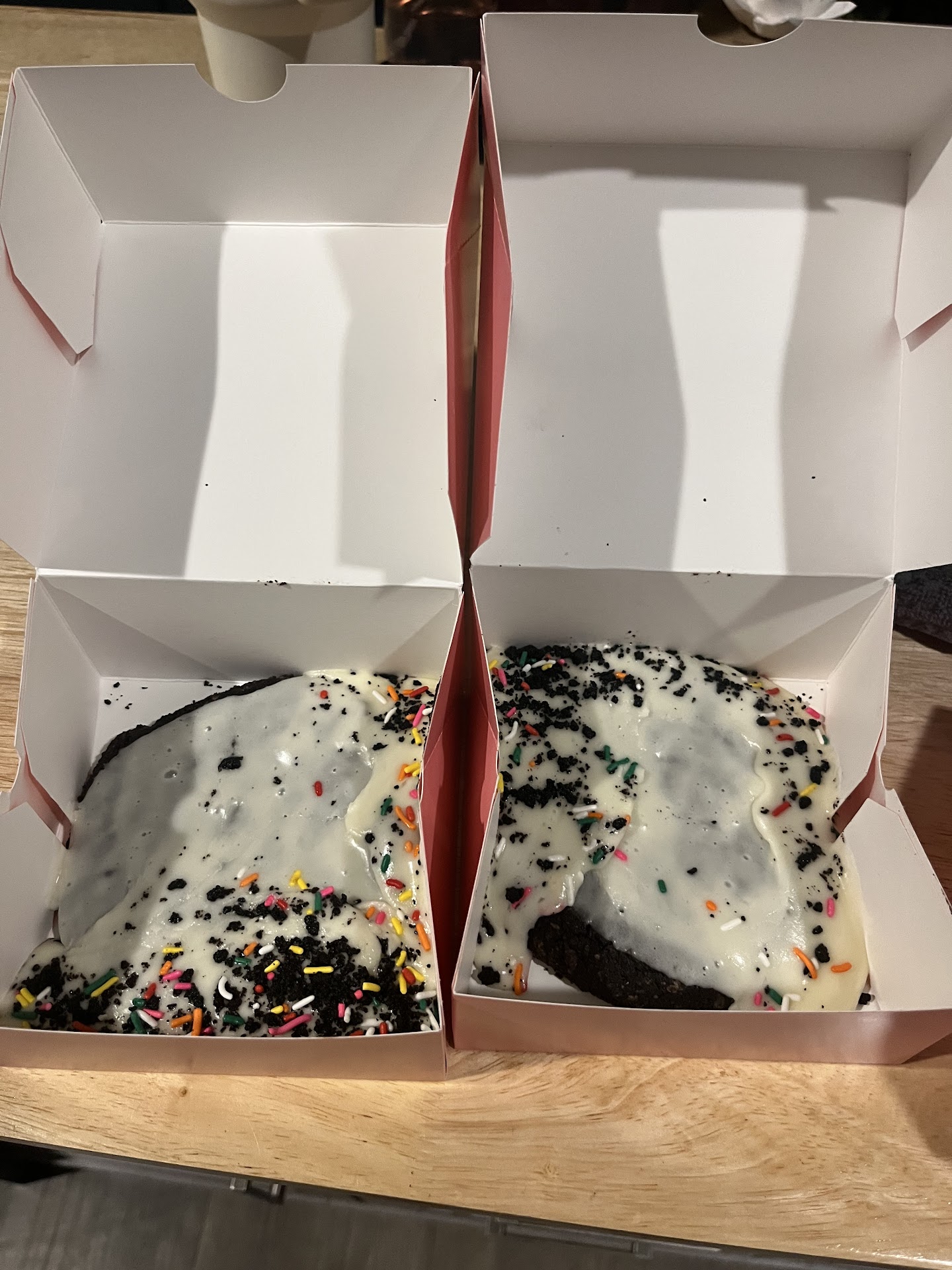 Read moreI promise you, this is my first and last time I’m ever coming here. Today was my first time ever getting Crumbl and I will say, customer service was not anything good. I was trying to ignore the fact that as I walked in I was not welcomed. I stood there for a moment waiting for someone to take my order, then after a minute I finally locked eyes with someone and said hello to them and said I was ready and they pointed at the self check out screen and I told them I’m sorry this is my first time here - hardly a reaction. I ordered my cookies, and after 4 minutes I heard our name and was told they’re in the oven and if I could wait 15 minutes and I said sure that’s fine! If I would’ve known that waiting for these to be baked was going to look like this. I would’ve just canceled my order. I did not think they’d serve something so hot off the sheet, you let them rest and cool down… as you can tell not cooled down. This is the birthday cake cookie ft. Oreo… what if it was for someone’s birthday? Absolutely disappointing. To add, the boys in the back of the house were playing with a blown up glove, bouncing it around like a balloon. I saw one girl take cash with her gloves on and went back to folding boxes, not sanitary. I wasn’t going to complain about these two things but after seeing the cookies, I’m complaining. I was hoping the cookie would taste good and just look ugly, but no. After trying the cookie, I gave it a chance but it...
