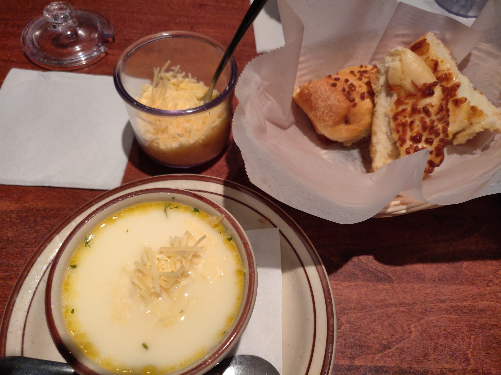 For the taste and presentation...The Chicken Rice Soup seemed very bland with no chicken. Not the soup that was always a go-to. The shredded parmesan cheese is still available, but only if you know to ask. The salad was watery and so plain. I did try the cheese bread. It was still very good, but apparently two people are now served 1 roll sliced into 3 pieces. The Food was served hot and the steak was very tender and flavorful. The baked potato was cooked well other than the problem that mgmt was alerted to. Now for presentation of the entree...Ridiculous small plate for a steak and baked potato. One Baker was obviously too large, so smashed to fit, pieces of potato was on the other end of the tiny plate and even under the steak and on top of the steak mixed with the upcharge of sauteed mushrooms. My mushrooms were atop my steak, my husband's were thrown to the side.Try cutting steak on a tiny plate with no room to use your knife...Yep, mushrooms shooting off the plate, baked potato falling apart and now even less room as now steak falling off the plate.