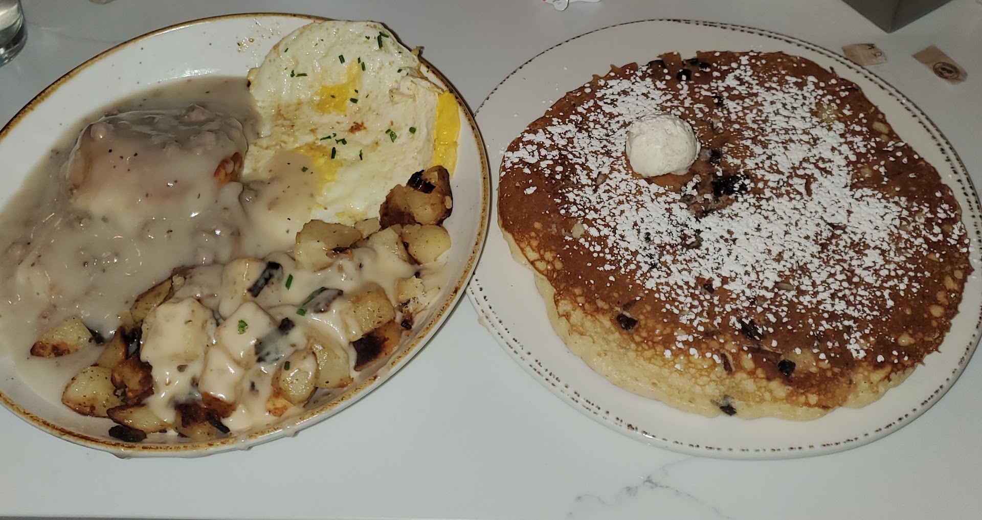 We all had good things to say about the food though. Our party shared the bacon and cheese cornbread. SOOO delicious! Very light and airy with just the right amount of bacon and cheese. I got the classic eggs Benedict and a side of biscuits and gravy, my husband ordered the Chickichanga. Both of us liked our dishes! I will say that the hollandaise sauce on mine was a bit too lemony though. But I did really like the biscuit and gravy. The potatoes I got with my main dish were nice and crispy too.
