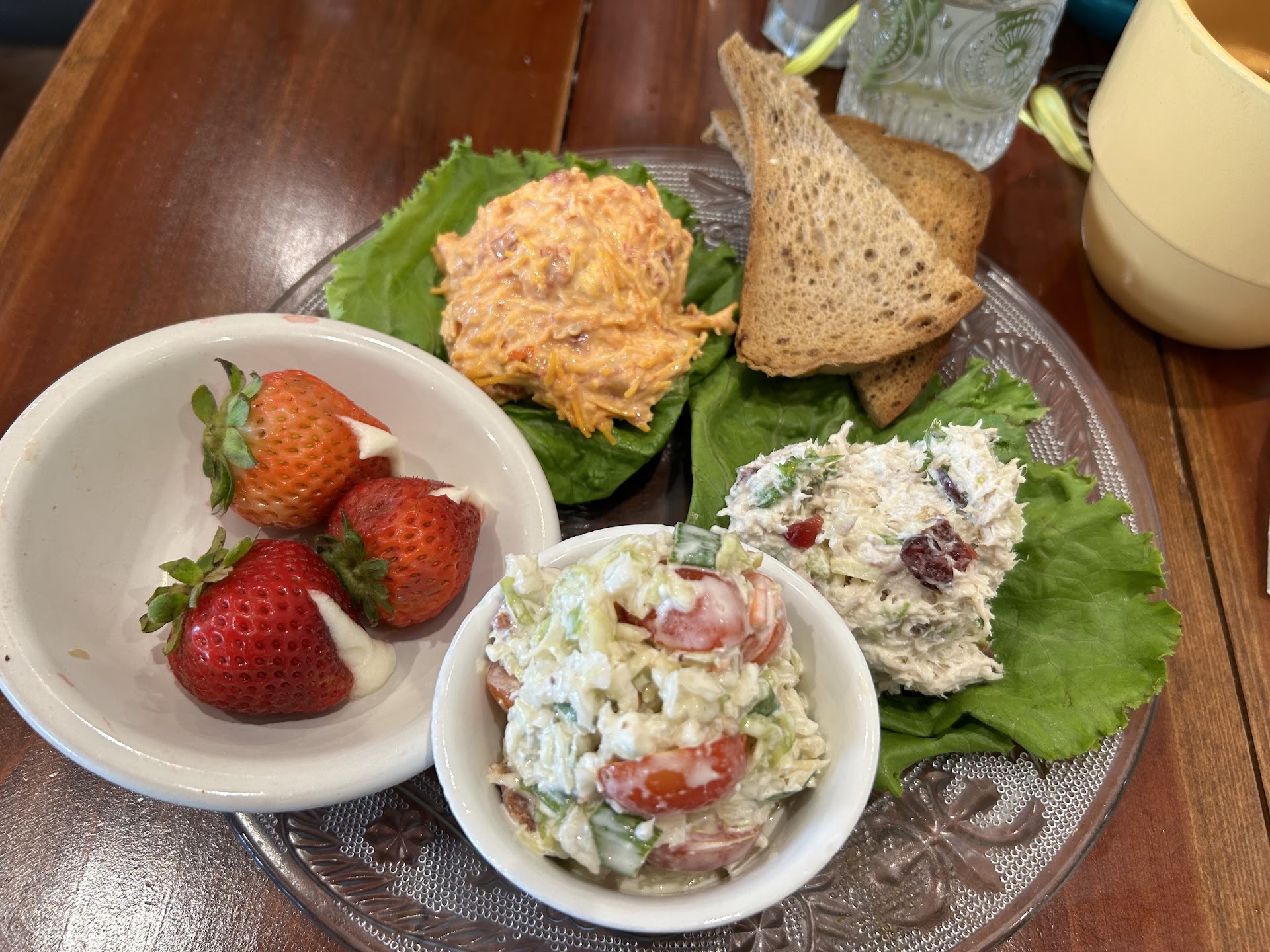 I opted for the Salad Sampler, $14. The Chicken Salad was just as remembered Delicious! The toast was good with the salad on top. My three filled Yummy Strawberries were gone fast!!! I also enjoyed my tomato slaw. It has a nice fresh taste. If you enjoy tomatoes I recommend. As far as the Pimento Salad I wasn’t a fan. I did try a couple of bites but now know that I personally would not order again. It wasn’t terrible it just didn’t have much flavor. Apparently, a lot of others enjoy it since they also sell it in to-go containers. You might like it.
