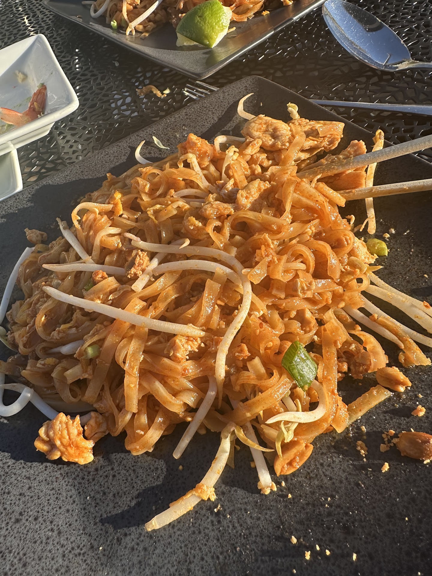 Read moreWe loved the name and location so decided to give it a try. We ordered the spring rolls to start. They were ok, but needed a little more flavor. The peanut dipping sauce was good. We both ordered sushi and it came out before our main entree, which was pad Thai for both of us. I had a crab cream cheese avocado roll and my husband had the dragon roll. Since I have celiac and am gluten free, I appreciated the sushi but again, needed was good - not out of this world. But when the pad Thai came, it was a different story. It was delicious. The presentation was nice, and the serving was huge. (I had dinner, lunch today, and dinner again tonight with the one pad Thai order). Service was exceptional. We were greeted, seated out on the patio because it was a beautiful day, and they checked on us often. The staff/owners were extremely knowledgeable about Celiac and gluten free requirements and had several suggestions. That makes a world of difference! All in all, it was a great meal and we will be back. Only had one pic because we dug in and forgot...