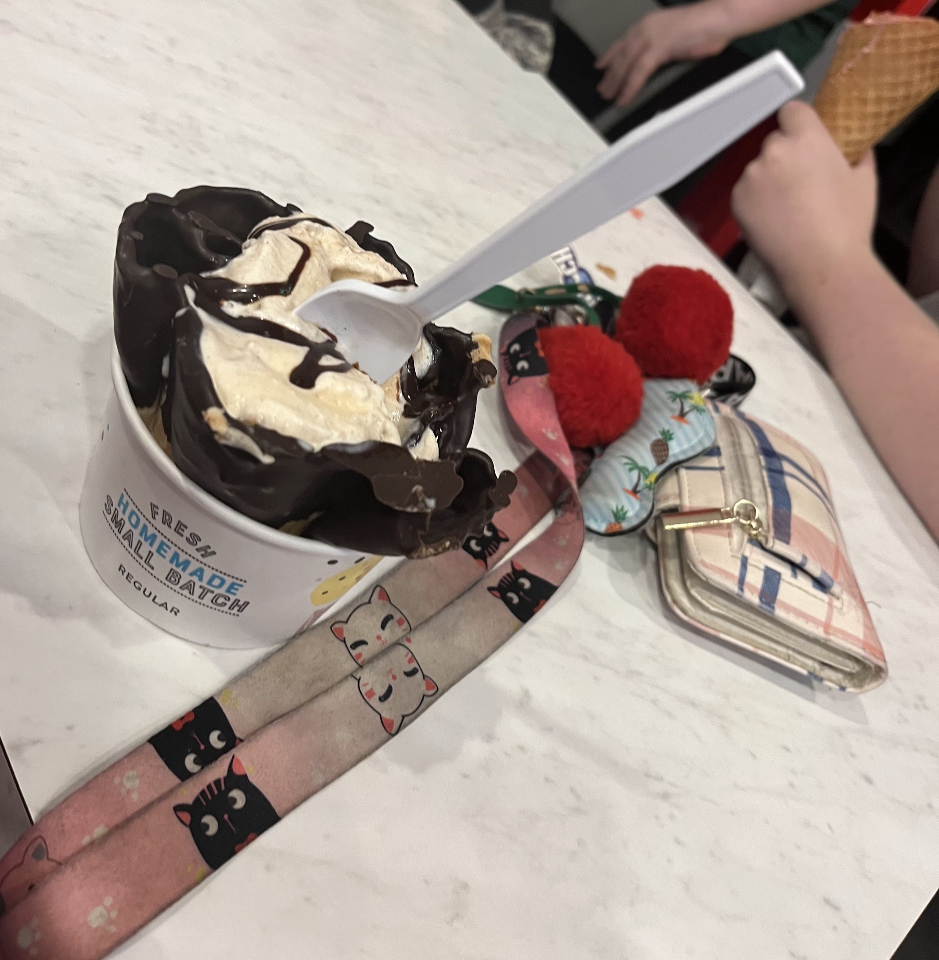 3.). The final straw. My 2 yr old dropped her cup of ice cream. She was seated at one of the tables. I had to pry one of the sales staff to come and clean it up. They clearly did not want to be disturbed from checking Instagram.