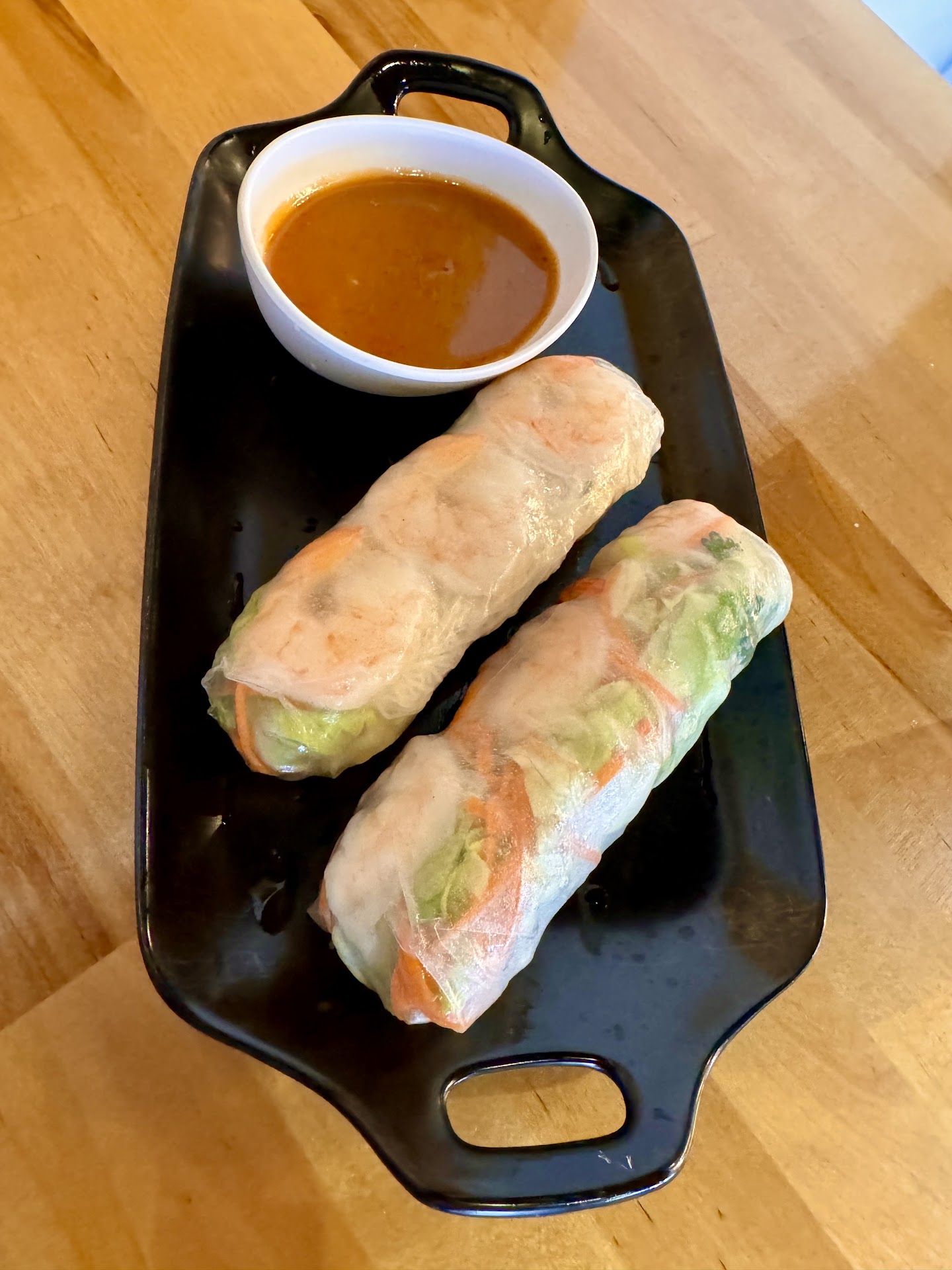 Jan 21, 2024: Shame on me for allowing four years to pass since my last visit to SaBaiDee Café. Saw their post on FB of “It’s just me & my mom in the kitchen” and had to go visit. When I walked in the place was humming and the ladies were running a marathon taking care of a packed house. I was seated at the only table left and KK got me a water and Beer Lao while I looked over the menu. Decided on the Spring Roll with shrimp and peanut sauce and the dish Khao Mun Gai.
