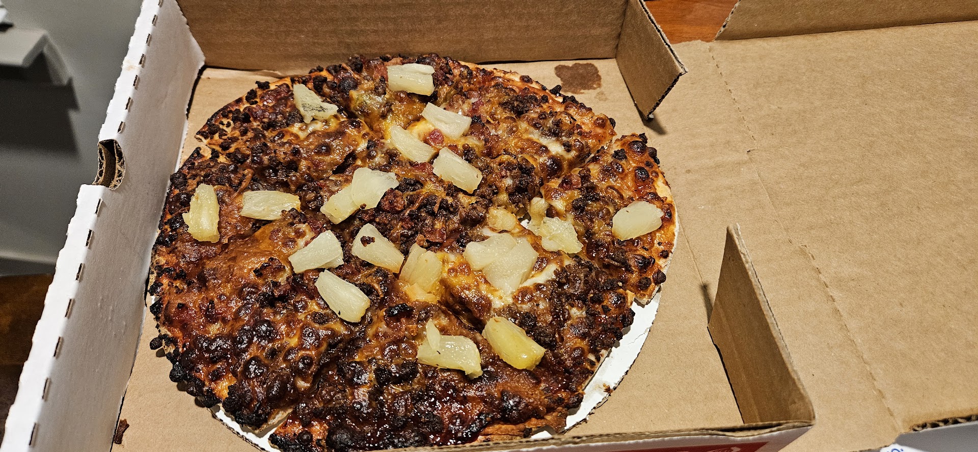 The pizza cheese was dark and burnt, which I thought stole away the flavor I was looking forward to and the pineapple seemed to be an afterthought because they looked like they were just tossed on top without being cooked in with the additional toppings.