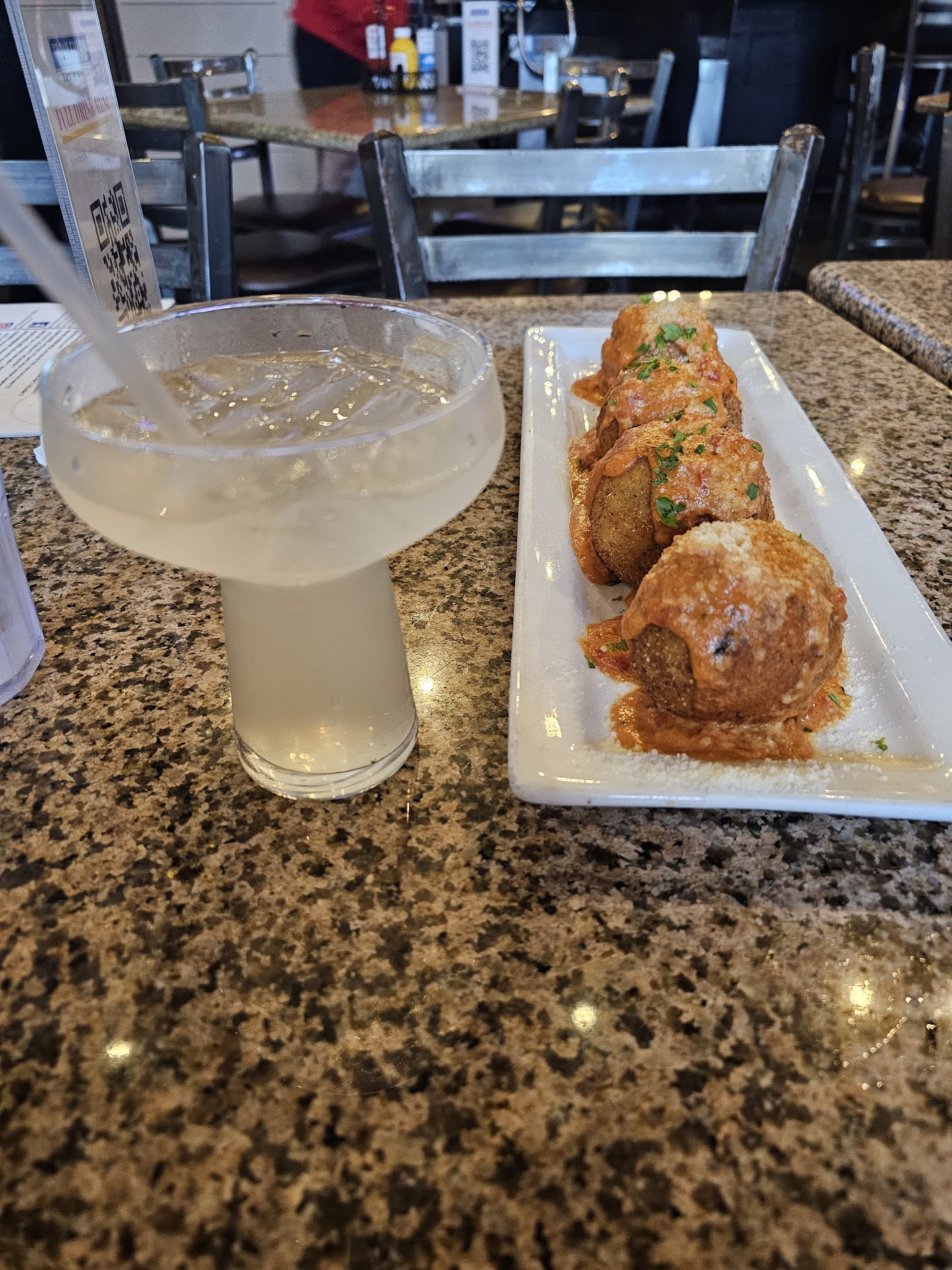 **The only real qualm I had about our visit was the delivery of the food. As I mentioned earlier, we ordered our app and our food at the same time. We got the app within 10 minutes, but then we received our food about 5 minutes after that. I think we had gotten through maybe ONE of the balls before our food arrived.