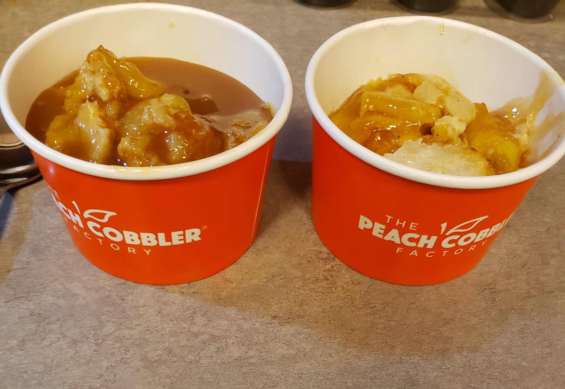 Read moreI was quite excited to try this place. I do love cobbler. I got the peach and the caramel apple. I got mine without the icecream since I'm lactose intolerant. Sad to say it wasn't very good. It's not a cobbler for nearly $10 a cup. I heated it up a bit to give it the best chance, the peaches were sort of crunchy which I found odd. Since usually its a nice kind of soft. I could really only taste the peach too. Not much else going on in flavor. For the caramel apple. It was the better one of the two. I expect apples to have more if a firmness. It is extremely caramelly. So, I would recommend having this with some sort of vanilla icecream to balance it out some. There is enough caramel it honestly mostly tastes like caramel with a hint of apple.