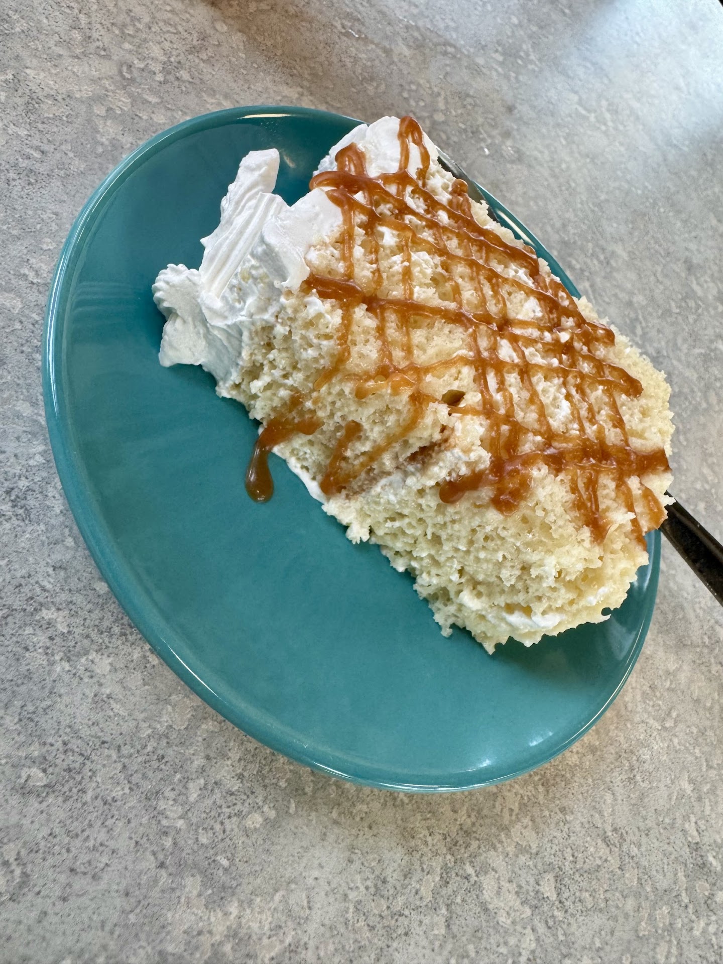 This is a really good homemade sandwich, and the croissant felt as if it just came out of the oven. The filling was more than ample while the flavors of chicken, apples, celery, and onions really complemented each other. Kinda hard to hold this sandwich together with all the filling but everything was fresh, crispy, and darn good! I liked the slaw...a mix of mayo and vinegar but the flavors were spot on and everything was wonderfully crunchy. Chef Luis brought around a tray of Tres Leche cake with a caramel drizzle to the ladies at the other table and me...gratis. I've got to say...this Tres Leche was exceptional, great flavors, the caramel gave it a nice kick, and the cake was firm but well soaked in milk.