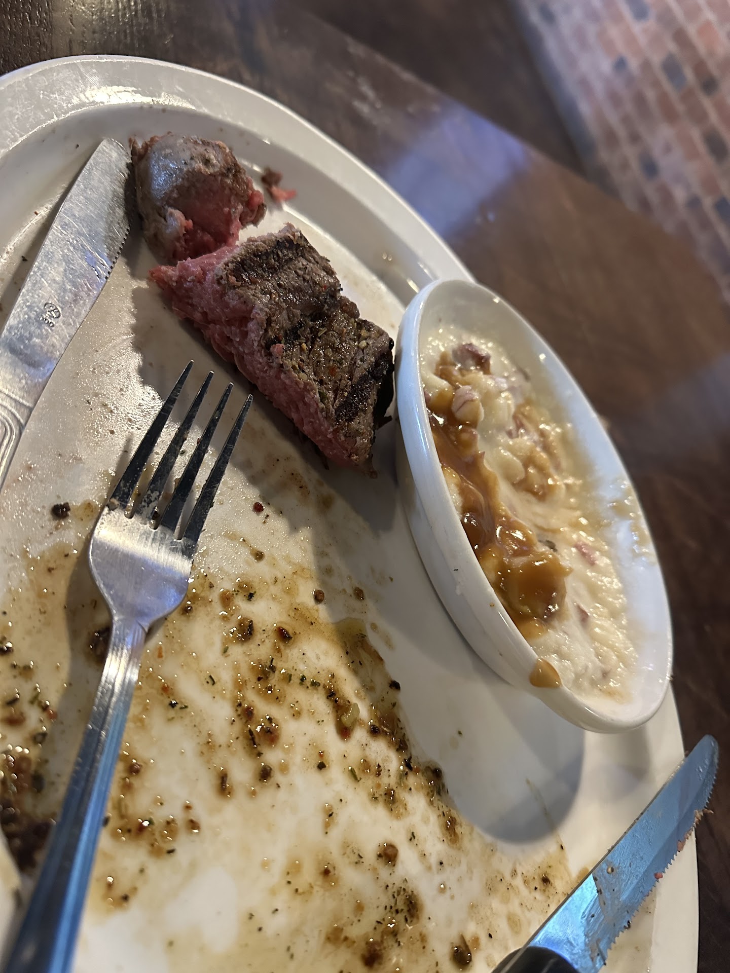 Again, in about 10 minutes the order arrived (your waitress does not bring your food out) the girl put the plates down and off she went in a jiffy leaving behind the large empty appetizer plate and no ketchup. After moving plates around and going around to see who was finished with theirs I found a bottle that I handed my wife.